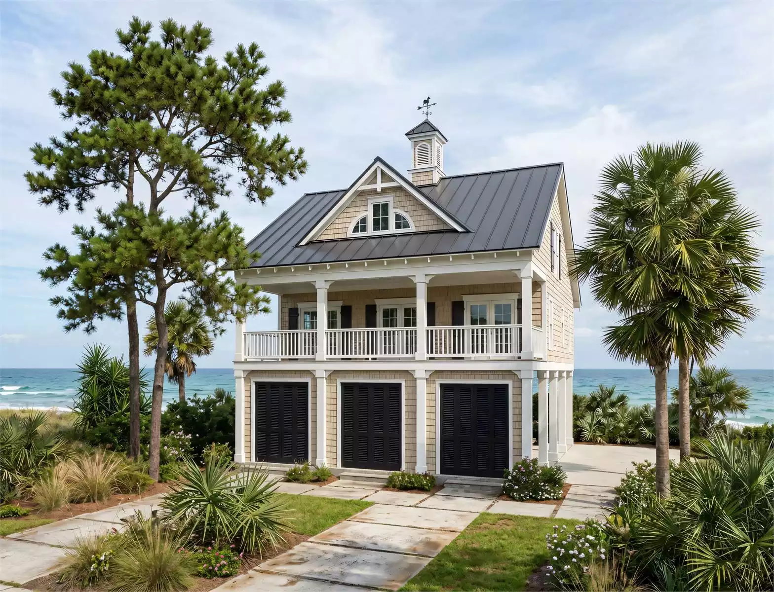 Designed as an affordable coastal beach cottage, this charming  three bedroom home offers relaxed seaside living with thoughtful design and beautiful views. A full-length front porch creates the perfect spot to enjoy ocean breezes, sunsets, and the surrounding beach scenery. The ground level is designed for versatility and convenience, functioning as an open carport while also providing an enclosed stairwell entry to the main living level. This level also includes a utility room and dedicated storage space, ideal for securing beach gear and seasonal items and rear covered porch. At the upper level, a glassed-in observation nook provides a quiet retreat and the perfect vantage point to take in sweeping coastal views.