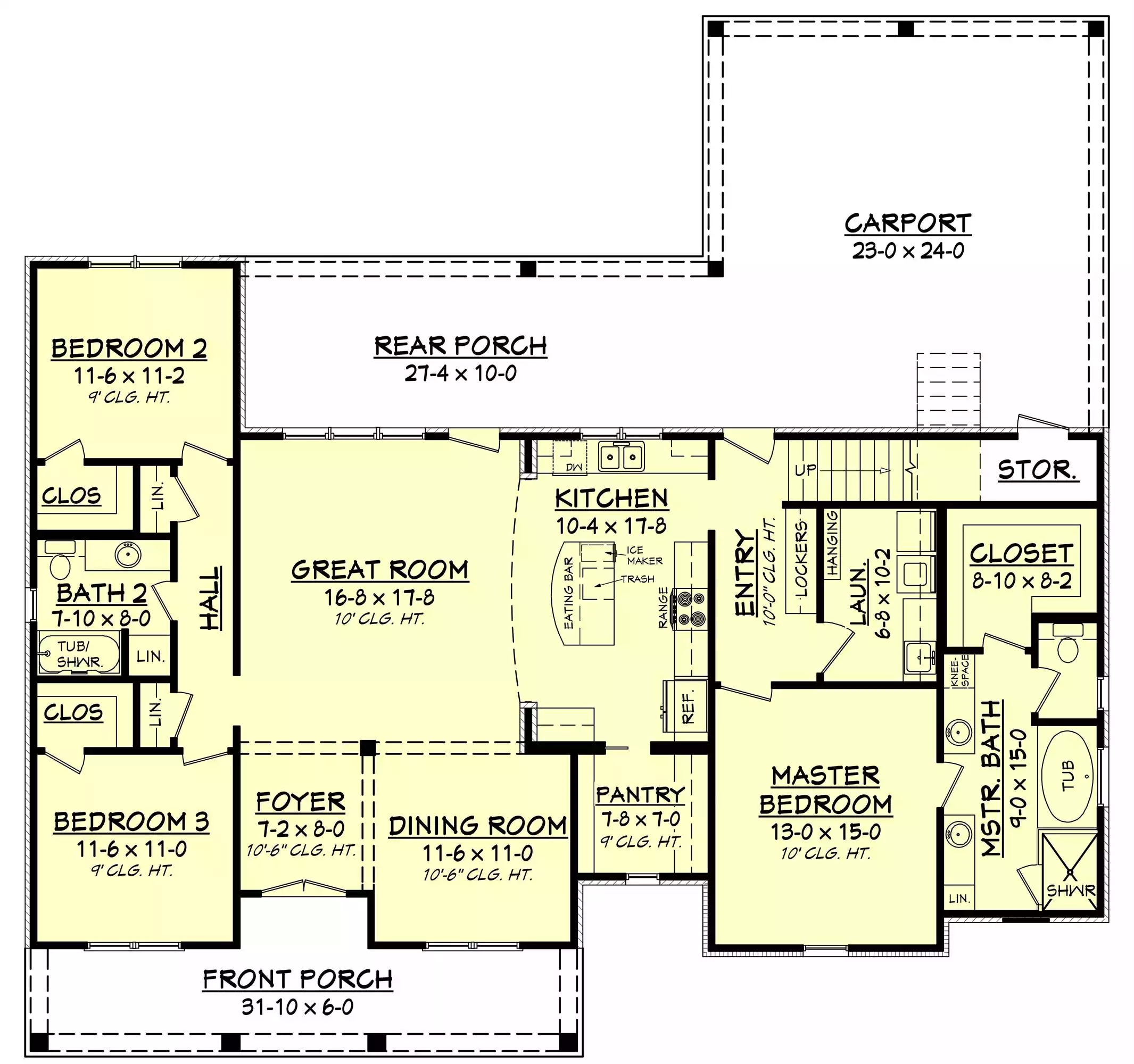 The Corrington house plan is a thoughtfully designed 1,900 sq. ft. modern farmhouse that blends timeless charm with everyday functionality. This single-story home features 3 bedrooms and 2 bathrooms, including a secluded primary suite with a spa-inspired bath and generous walk-in closet. At the heart of the layout is an open-concept great room with a cozy fireplace that flows effortlessly into the kitchen and dining area—ideal for gathering and entertaining. The kitchen features a large center island and a walk-in pantry for extra storage and prep space. Above the attached carport, a bonus room offers flexible space that can serve as a guest suite, office, or media room. With its classic farmhouse lines, smart layout, and functional extras, the Corrington plan is a perfect fit for modern living with a rustic edge.
