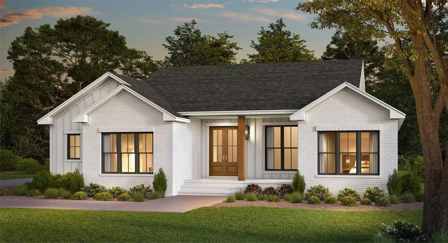 The Palmetto Haven is a smartly styled 1,597 sq. ft. transitional farmhouse that blends clean, modern lines with timeless comfort. This 3-bedroom, 2.5-bath single-story layout is ideal for homeowners who value both functionality and relaxed living. The private primary suite is tucked away with a luxurious bath featuring a freestanding tub, oversized shower, and generous walk-in closet. At the center of the home, a vaulted great room with wood beams connects effortlessly to the kitchen and dining nook, making everyday moments feel cozy and connected. The kitchen shines with a large island and walk-in pantry, while a split-bedroom layout gives extra privacy to the secondary bedrooms and shared bath. A built-in mudroom locker area and spacious utility room help keep things tidy. And for hobbyists or gearheads, the oversized 2-car garage includes space for a workshop. Palmetto Haven delivers stylish simplicity with all the practical touches that make a house feel like home.