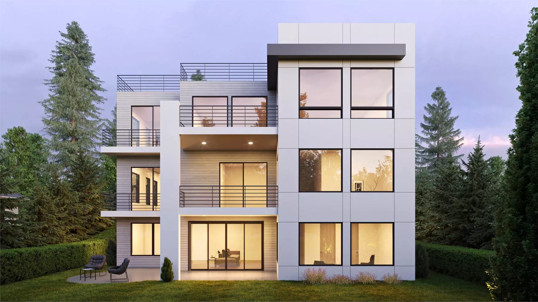 Got an amazing view? Looking for a luxury home that'll adapt to a slope? House Plan 3425 is here for your consideration! This stunning contemporary design offers 5,471 square feet with five bedrooms across two stories plus a finished walkout basement. Plus, the inverted layout is optimized for capturing sights in the distance! The entry level is where you'll find the three-car front-entry garage, a formal living room or leisure space, and two bedroom suites--one with a five-piece bath and the other with a four-piece bath. The bedrooms and the leisure space all connect to decks, and there's a laundry room for convenience. Head upstairs to find all the main living areas and the primary suite. The suite is placed in front, so it has a deck over the garage, and it impresses with a vaulted bedroom with a wet bar, a spacious five-piece bath, and a walk-in closet. Don't want to lug laundry downstairs? There's also a laundry closet just outside the suite! Head toward the back of this floor and the L-shaped kitchen has a huge, nearly square island and a walk-in pantry, and it overlooks the sunny dining and living areas--again, with deck access. There's also an office on this level, and you'll find a door to an exterior landing behind it. Where do those stairs lead? To a rooftop deck, of course! You'll find the rest of the finished space in the basement level, where two bedrooms share a divided Jack-and-Jill bath. There's also a rec room with a wet bar. With this layout, House Plan 3425 is perfect for larger families and hosting--make sure not to miss that it has a powder room on each floor and an elevator that connects all three, too!