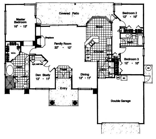 This great room plan is perfect if you are looking for more space and less formality. The master bedroom has lots of glass and a split-entry master's foyer, which separates sleeping and bath areas. A huge walk-in closet in the bath, double vanity and separate shower/toilet space is efficient and well planned. The den/study can even double as a nursery for a young family. The secondary bedrooms share a bath, and, with a "kid's door" off the hallway to the rear yard, the bath becomes pool accessible. This is the perfect open and airy plan for the young family or empty nester.