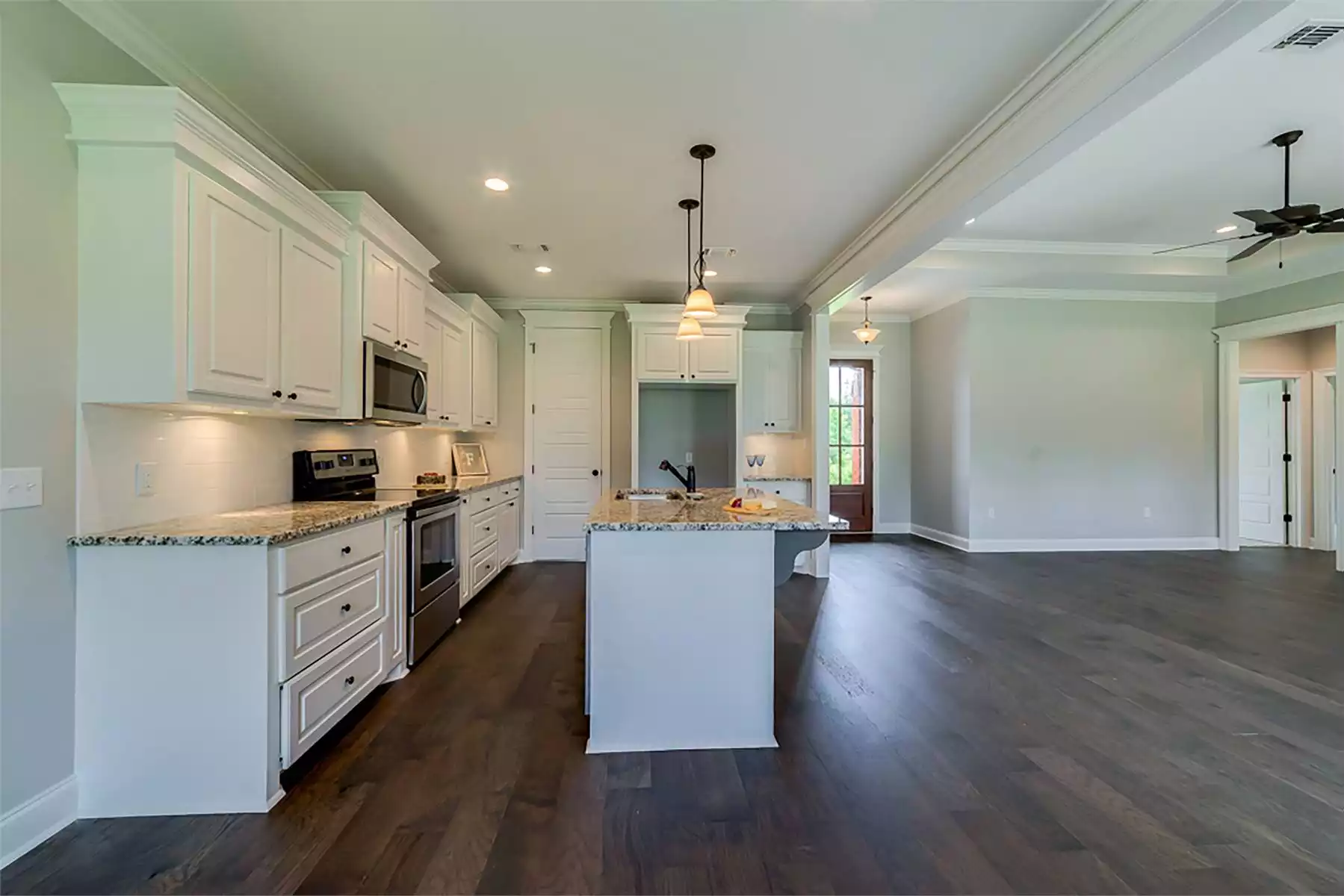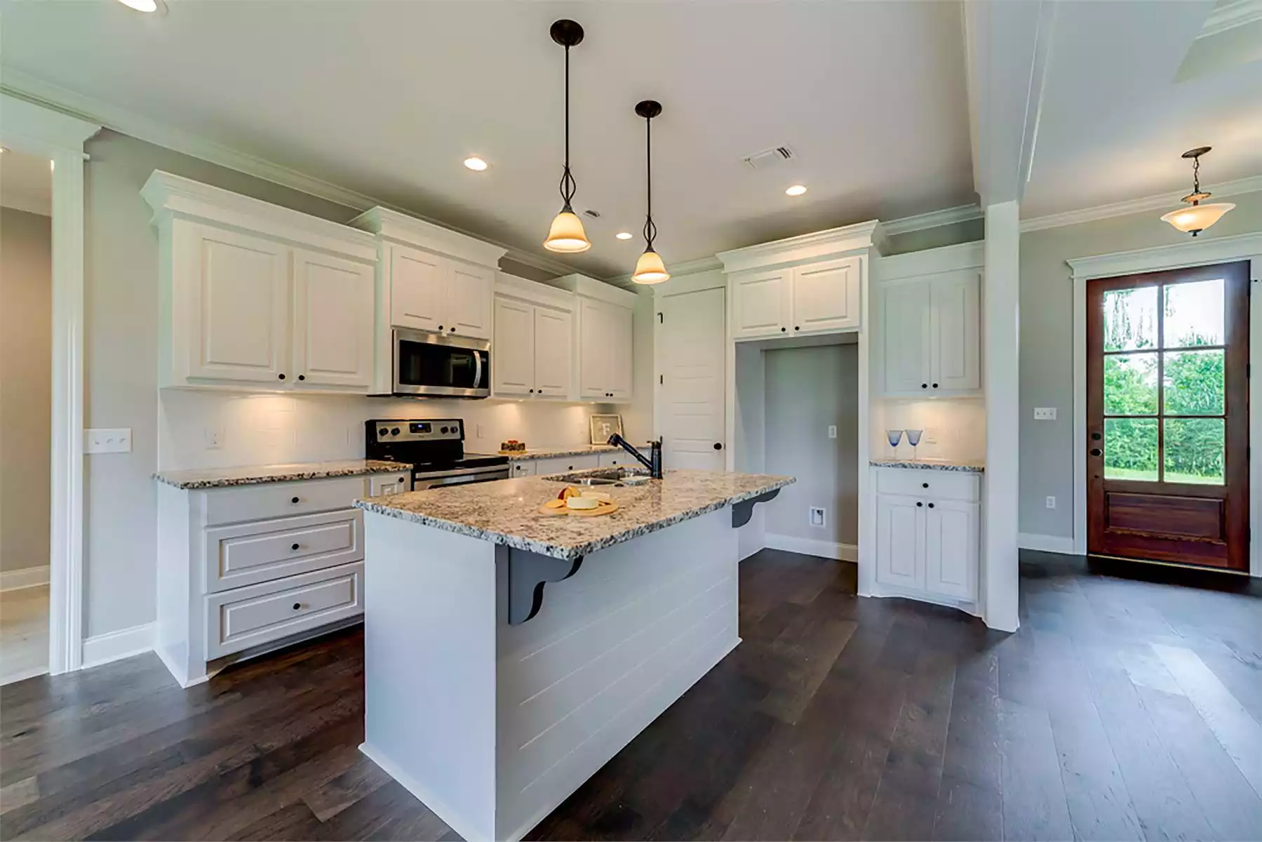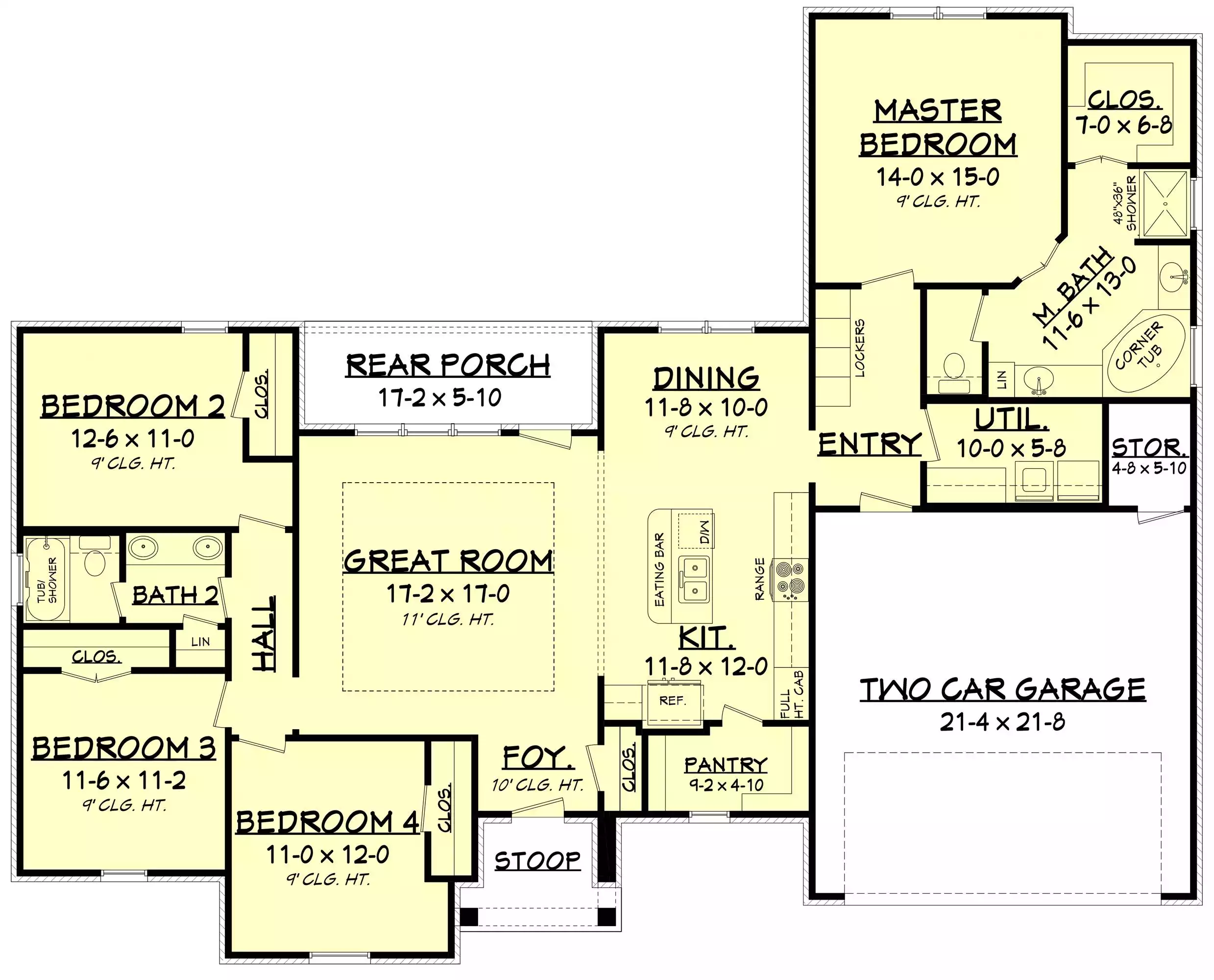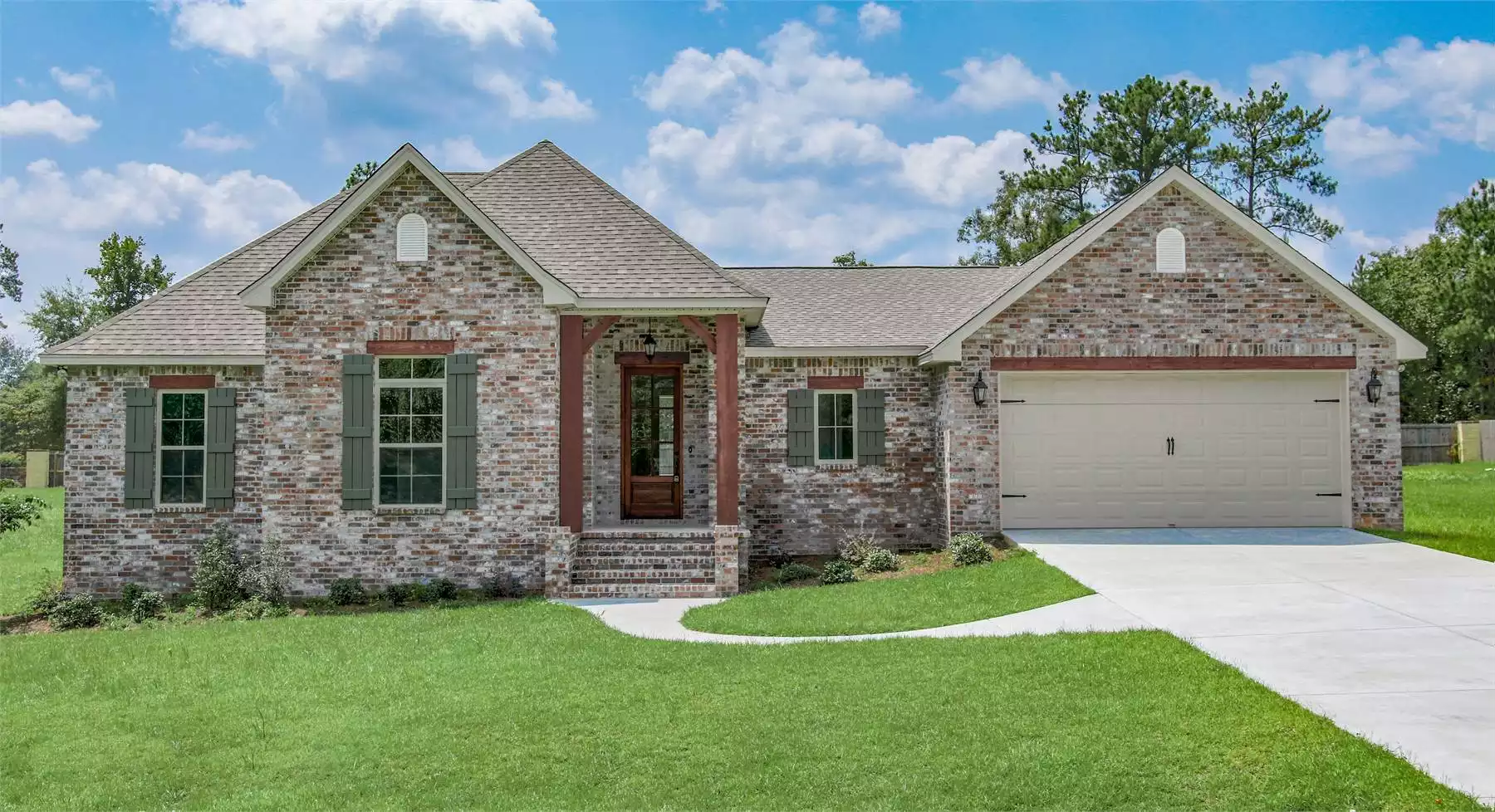 The Porterville house plan is a thoughtfully designed 1,889 sq. ft. country-style home that seamlessly blends comfort with functionality. This single-story layout includes 4 bedrooms and 2 bathrooms, featuring a private primary suite with a luxurious bath and spacious walk-in closet. The heart of the home boasts a generous great room with an 11' tray ceiling and a cozy fireplace, flowing effortlessly into the kitchen and dining area to create an open and inviting living space. The kitchen is equipped with a large island with seating, a walk-in pantry, and ample cabinetry, enhancing its practicality. The split-bedroom design ensures privacy, with three additional bedrooms sharing a well-appointed bathroom on the opposite side of the home. A functional family entry from the garage includes built-in lockers, providing a convenient space to organize daily essentials. With its country charm and efficient layout, the Porterville plan caters to those seeking a stylish yet practical home.