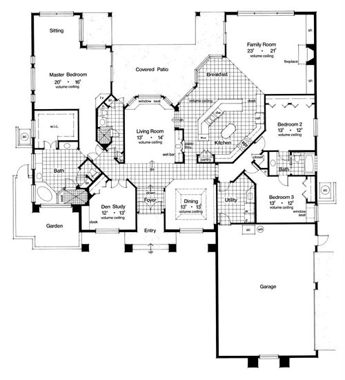 Double glass doors welcome you to a raised foyer with a spectacular view through the sunken living room to the patio. The trayed ceiling of the dining room and sculptured dry wall elements create a truly custom look. As you pass the double doors of the den/study, which can access the powder/patio bath, you enter the master suite, complete with its own sitting area. The master bath has his and her vanities and share a huge walk-in closet. A corner soaking tub, oversized shower, and private toilet room complete the design. The family wing combines a spectacular island kitchen with formal wet bar off the living room, bay windowed nook, and family room with media/fireplace wall. Two secondary bedrooms share a full private bath. Note the window seat in bedroom 3.