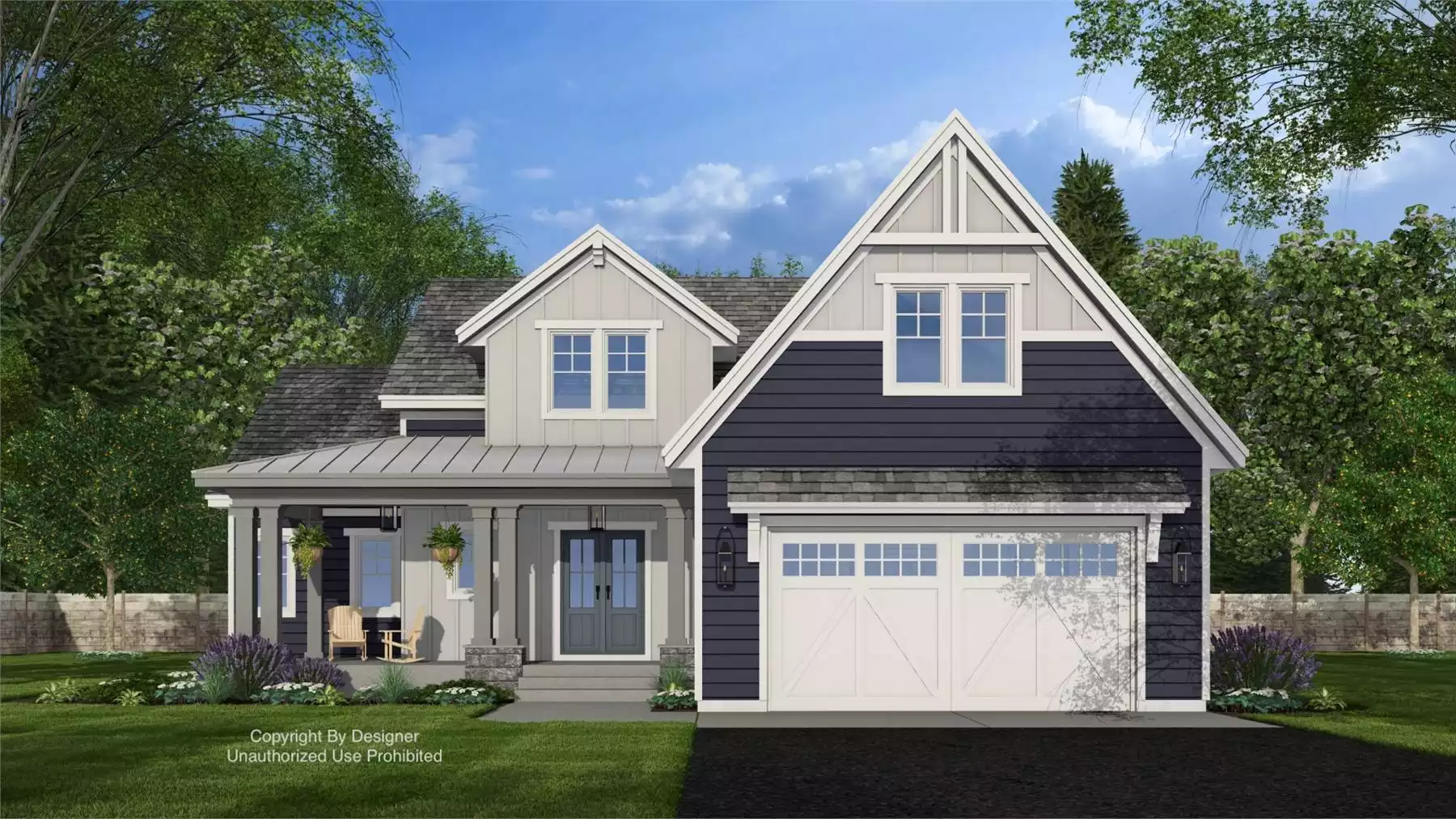 The open layout connects the kitchen, dining area, and great room, complete with a fireplace and large island. A covered rear porch extends the living space outdoors for easy entertaining. The main-level primary suite features dual vanities, a walk-in shower, and ample closet space. A guest bedroom with a full bath, plus a mudroom and half bath, offer added convenience.