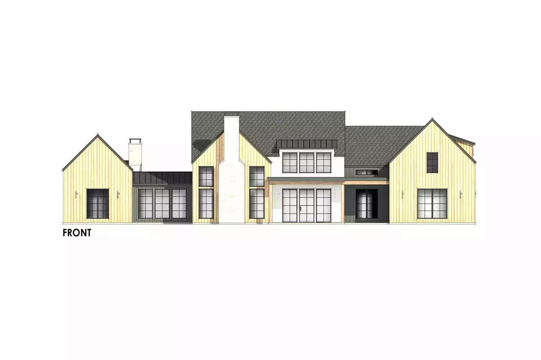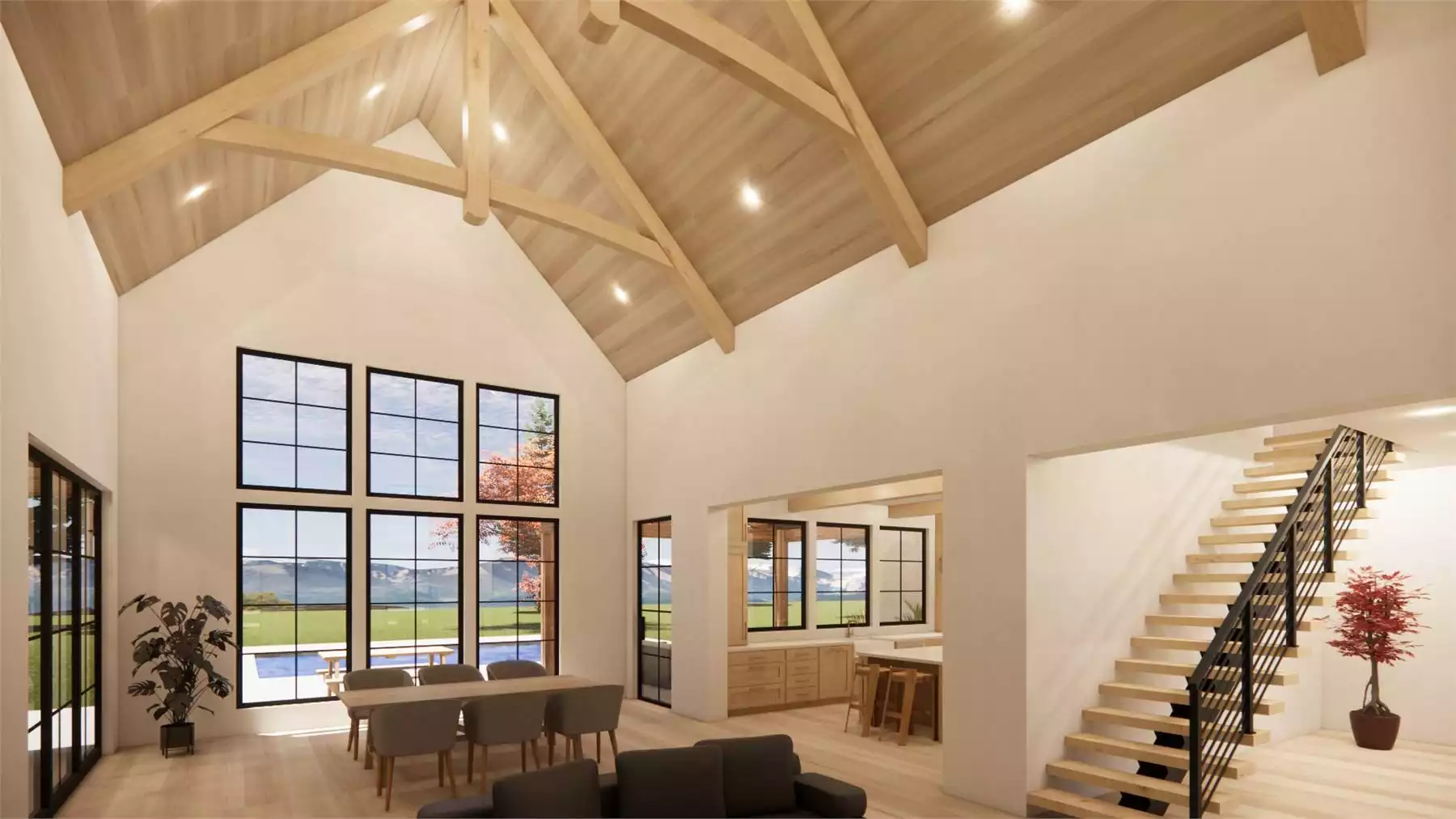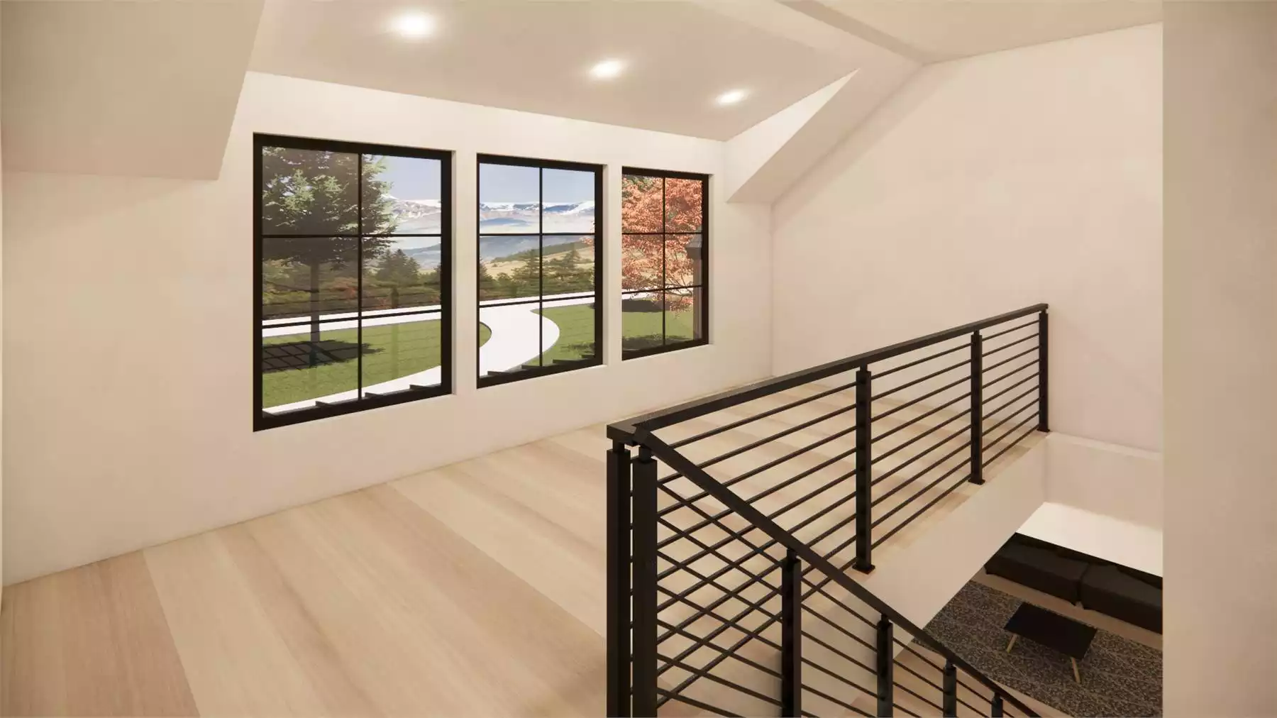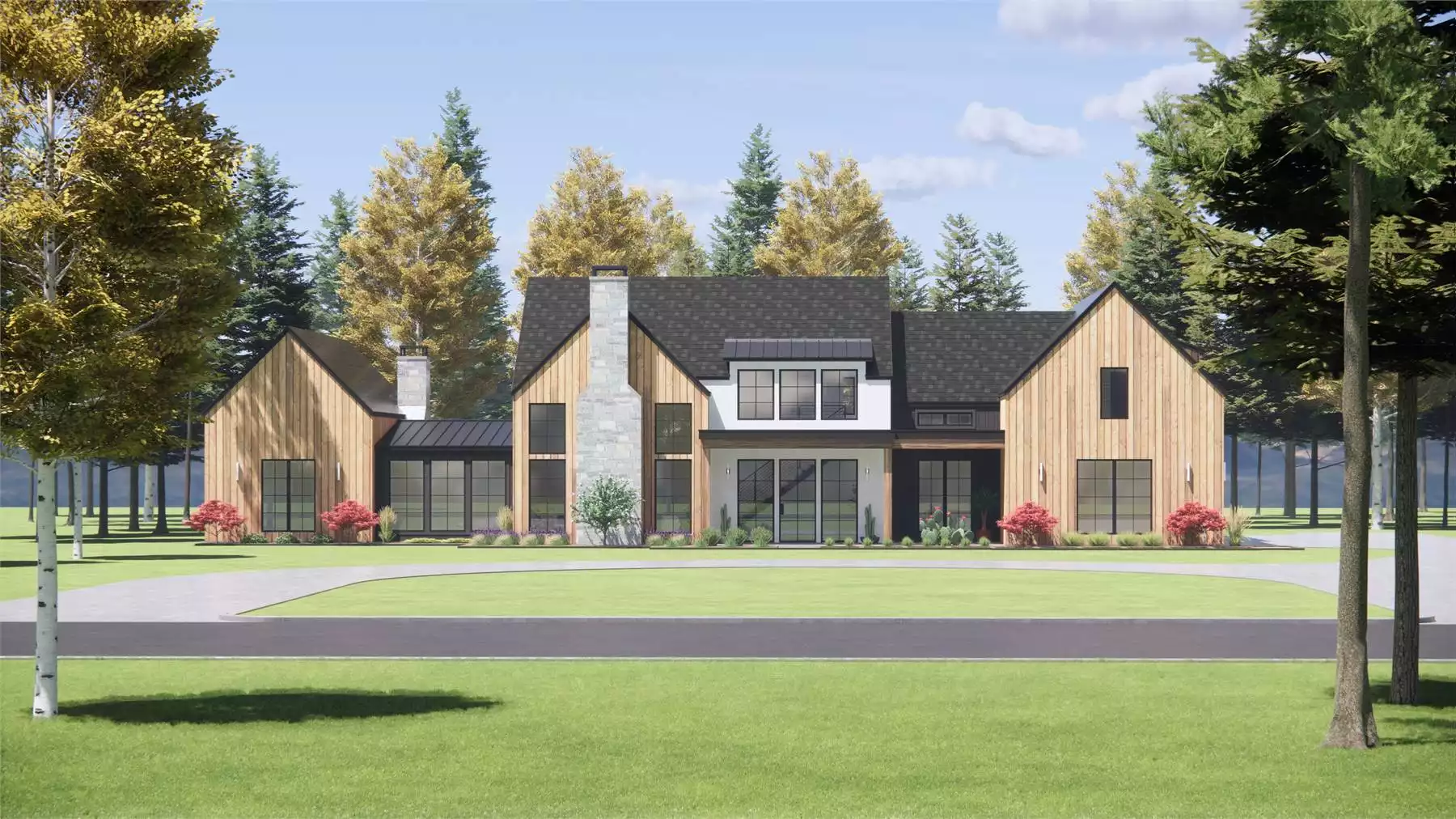 If you're searching for a luxury farmhouse design inspired by contemporary Scandinavian aesthetics, look no further than House Plan 5078! This dramatic home wows from the street with its breadth and balanced facade featuring wood, painted siding, stone, and large windows. It even provides garage parking for four vehicles hidden on one side! When you enter the spacious main level, the floating stairs in the entry hall and the cathedral vaulted great room set the tone for the interior. Ceiling trusses and beams add a rustic touch across the open living area and the large U-shaped kitchen with an island. The family foyer, laundry/utility room, pantry, and powder room sit between the kitchen and the garage while the primary bedroom suite is on the opposite side of the house, through the great room and at the end of the glass-lined hall flanked by the office and courtyard. The suite boasts a vaulted bedroom ceiling, a five-piece bath, a large walk-in closet, and tons of privacy with this location. Three bedrooms with their own three-piece ensuite baths are placed upstairs along with the loft and game room, giving the kids plenty of private space as well!