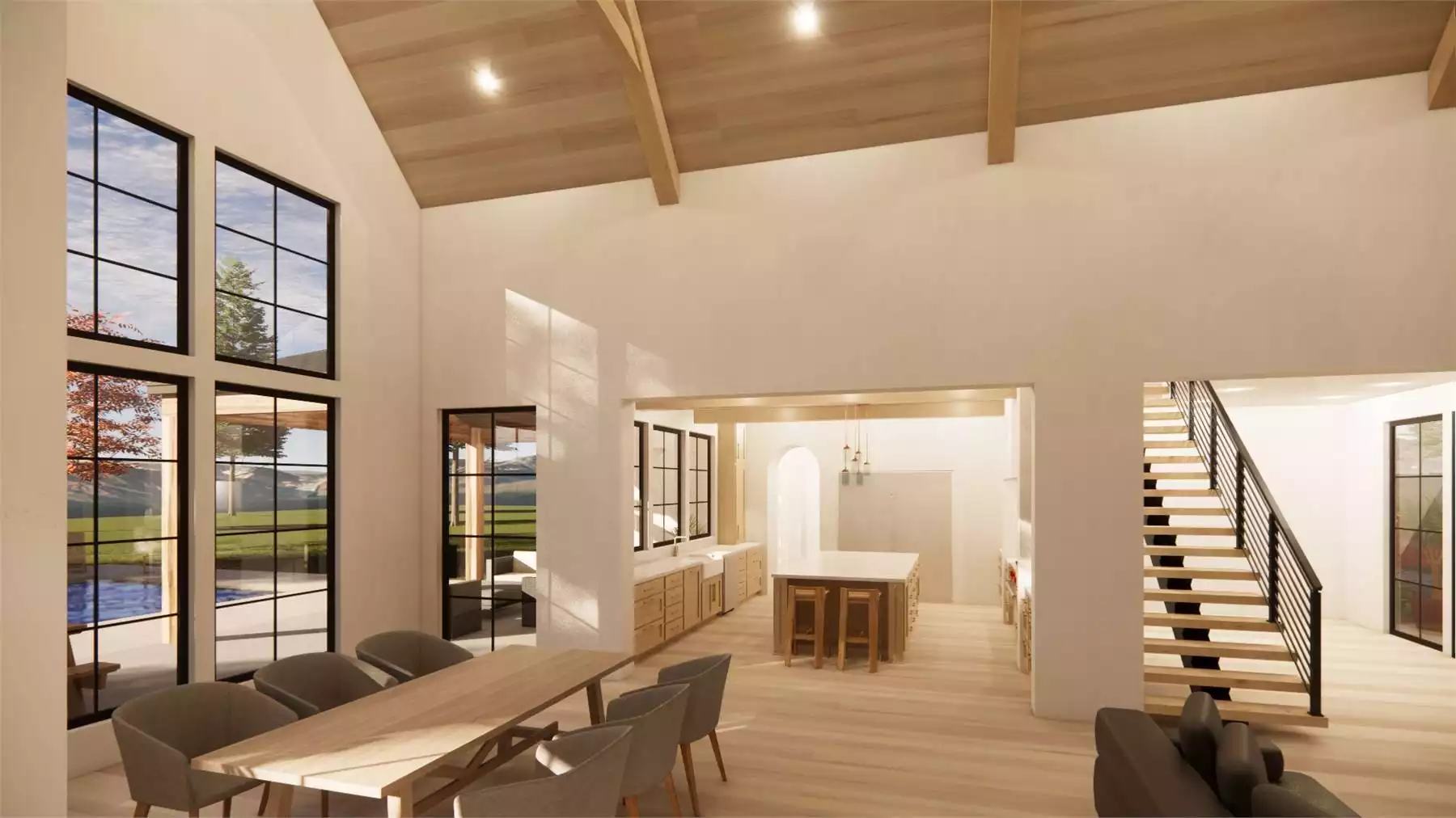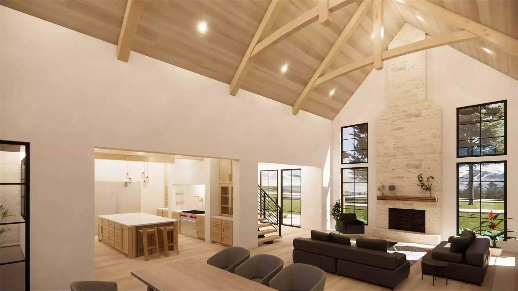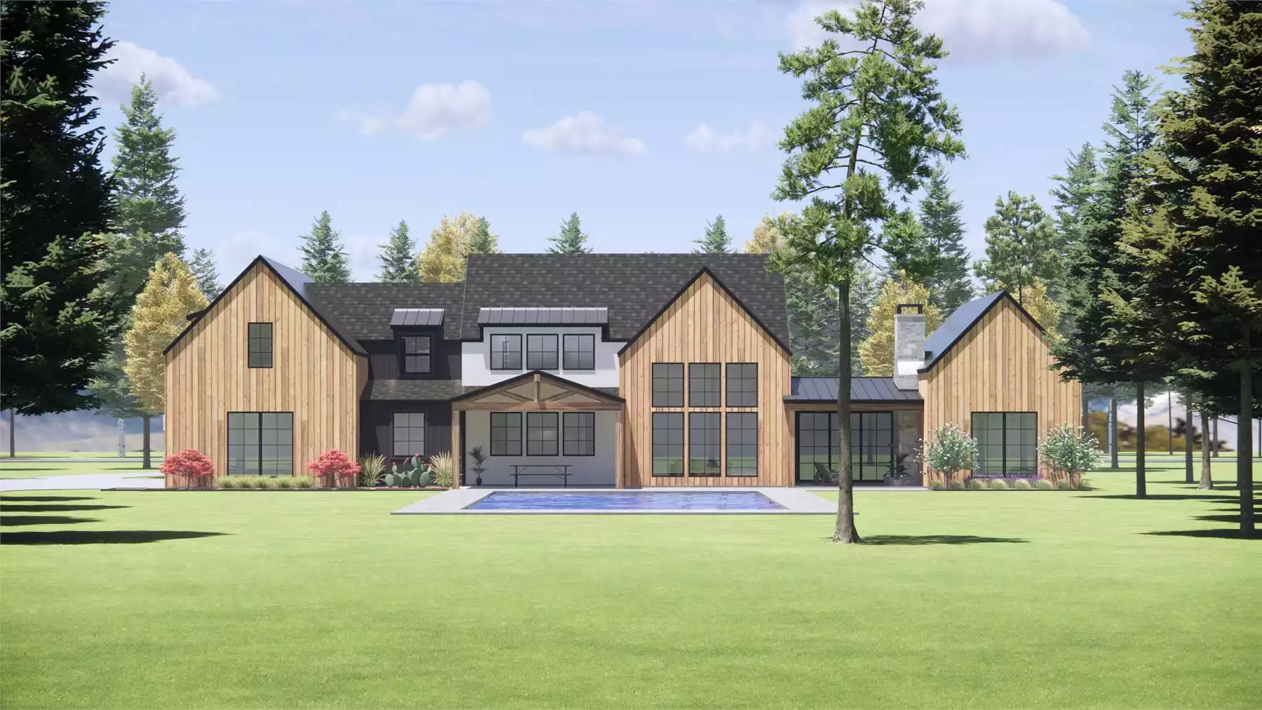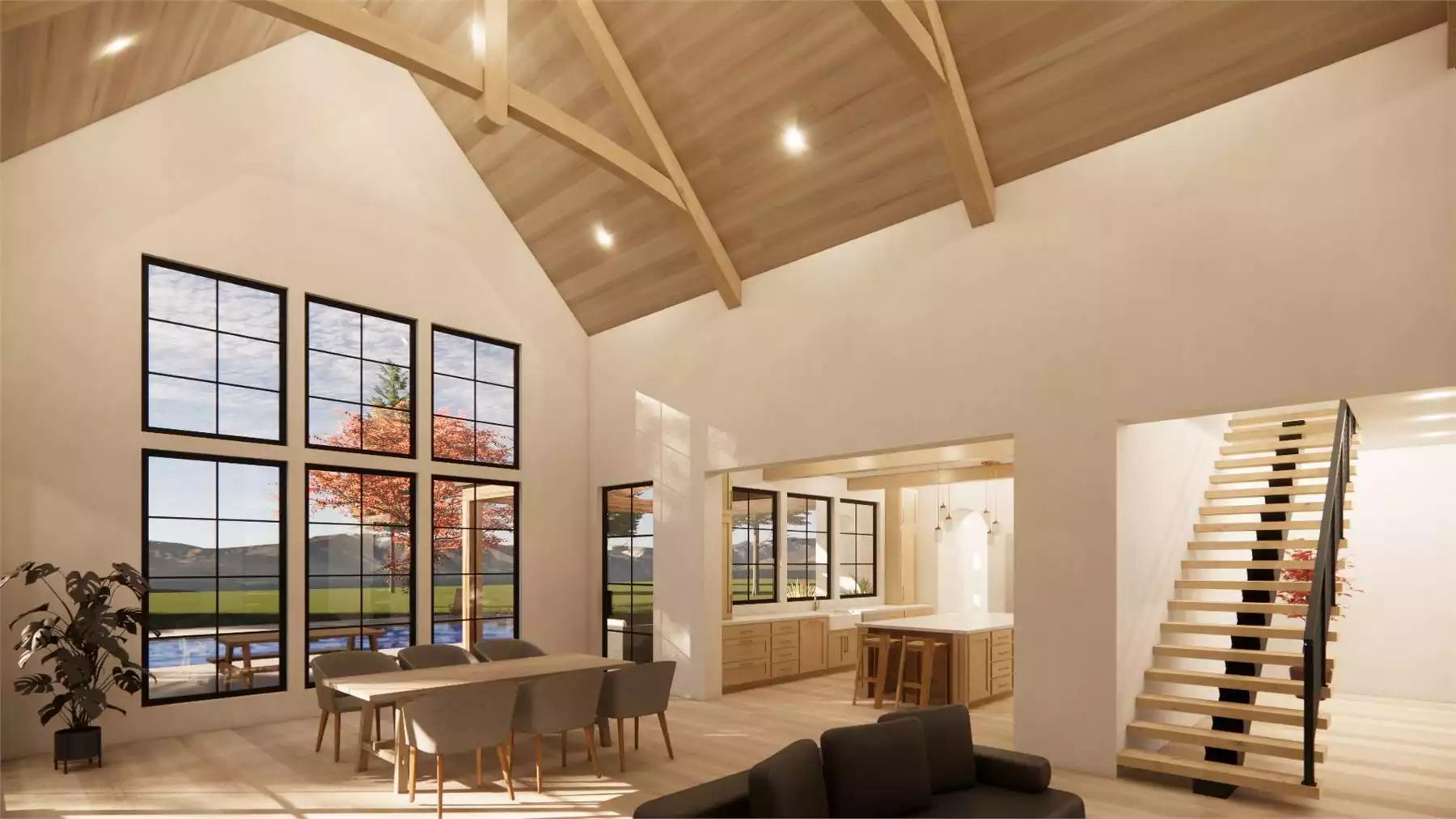 If you're searching for a luxury farmhouse design inspired by contemporary Scandinavian aesthetics, look no further than House Plan 5078! This dramatic home wows from the street with its breadth and balanced facade featuring wood, painted siding, stone, and large windows. It even provides garage parking for four vehicles hidden on one side! When you enter the spacious main level, the floating stairs in the entry hall and the cathedral vaulted great room set the tone for the interior. Ceiling trusses and beams add a rustic touch across the open living area and the large U-shaped kitchen with an island. The family foyer, laundry/utility room, pantry, and powder room sit between the kitchen and the garage while the primary bedroom suite is on the opposite side of the house, through the great room and at the end of the glass-lined hall flanked by the office and courtyard. The suite boasts a vaulted bedroom ceiling, a five-piece bath, a large walk-in closet, and tons of privacy with this location. Three bedrooms with their own three-piece ensuite baths are placed upstairs along with the loft and game room, giving the kids plenty of private space as well!