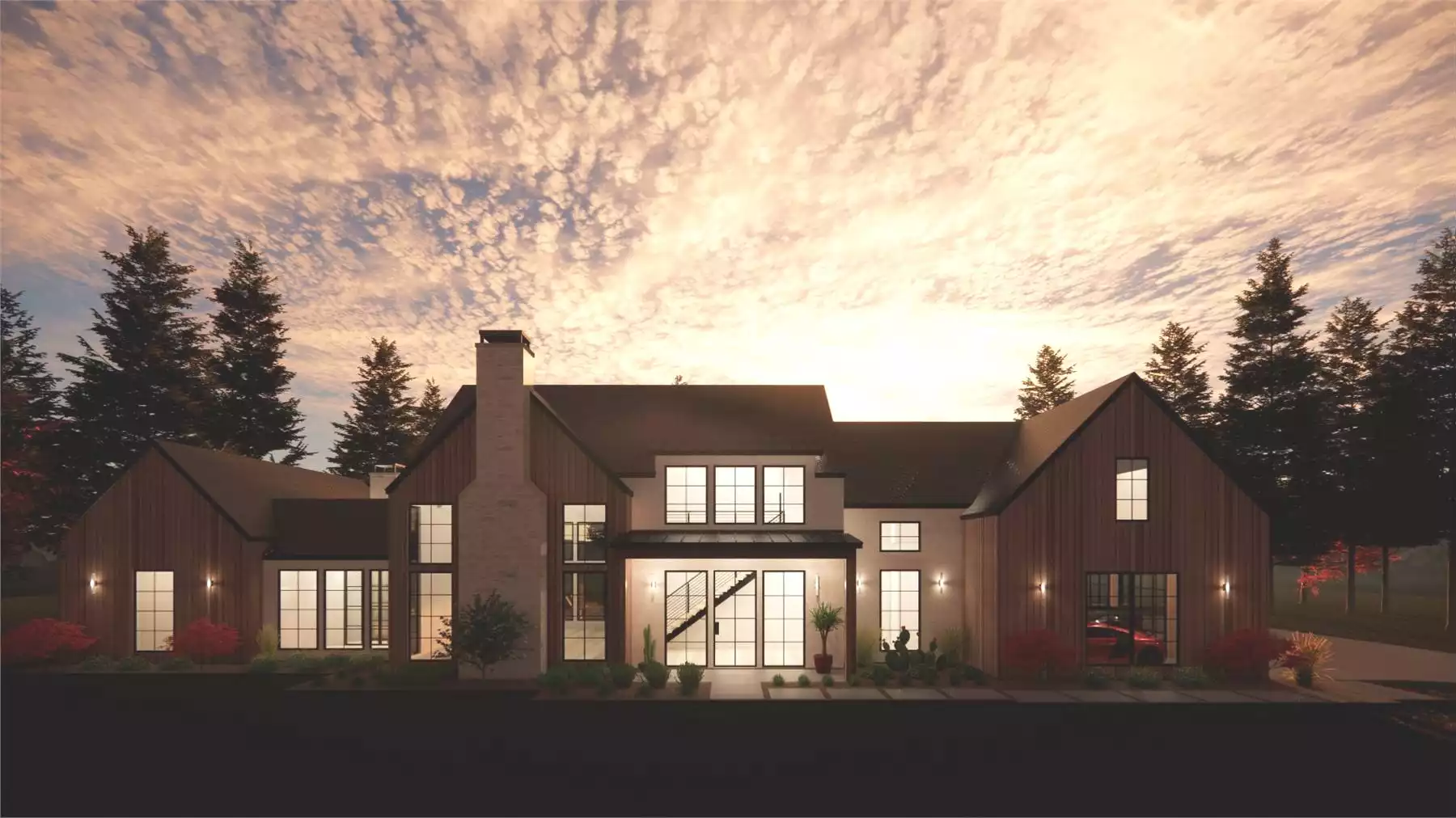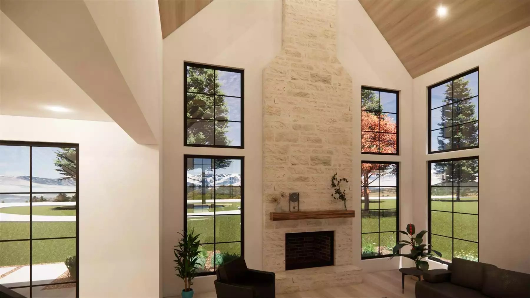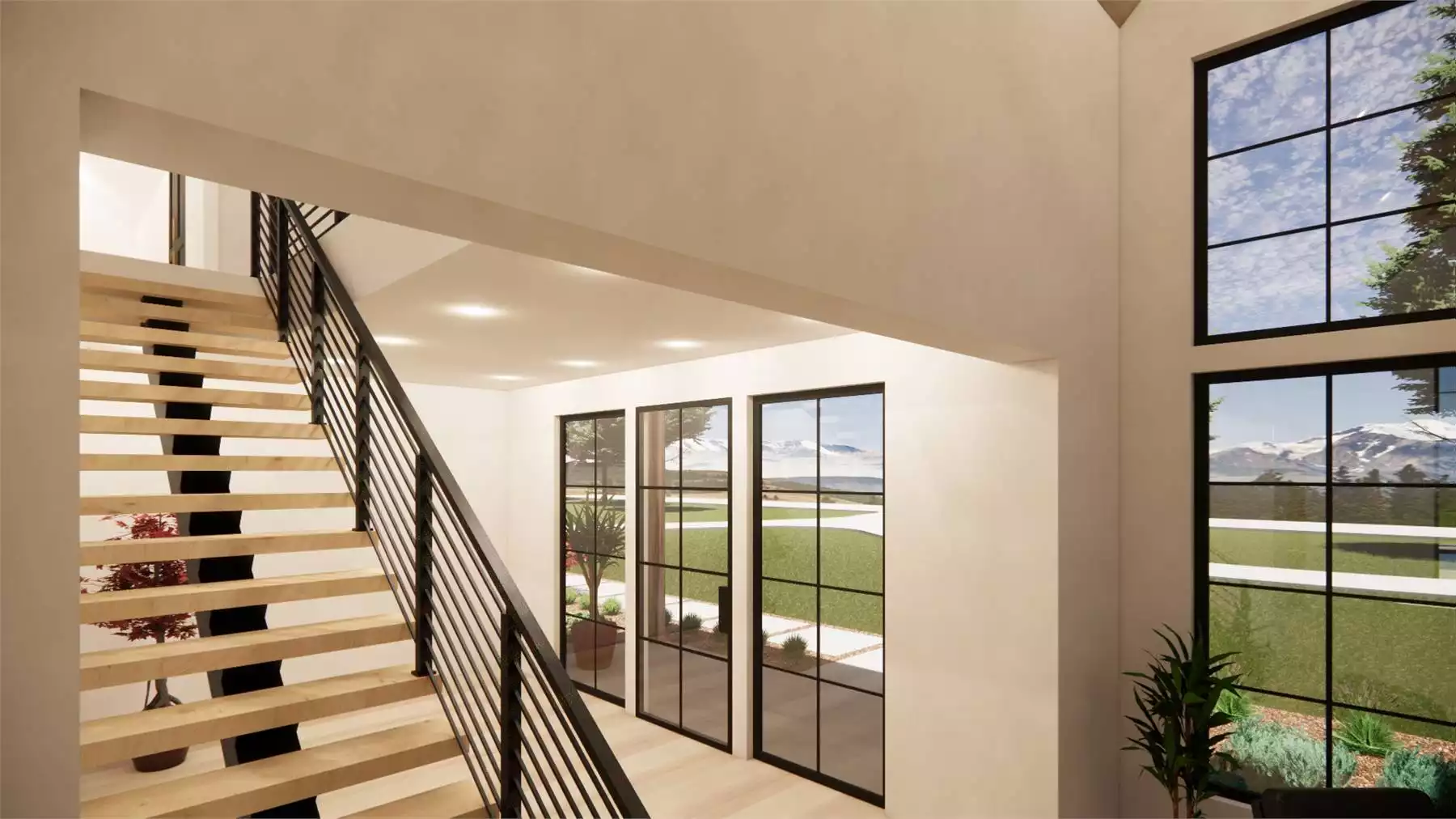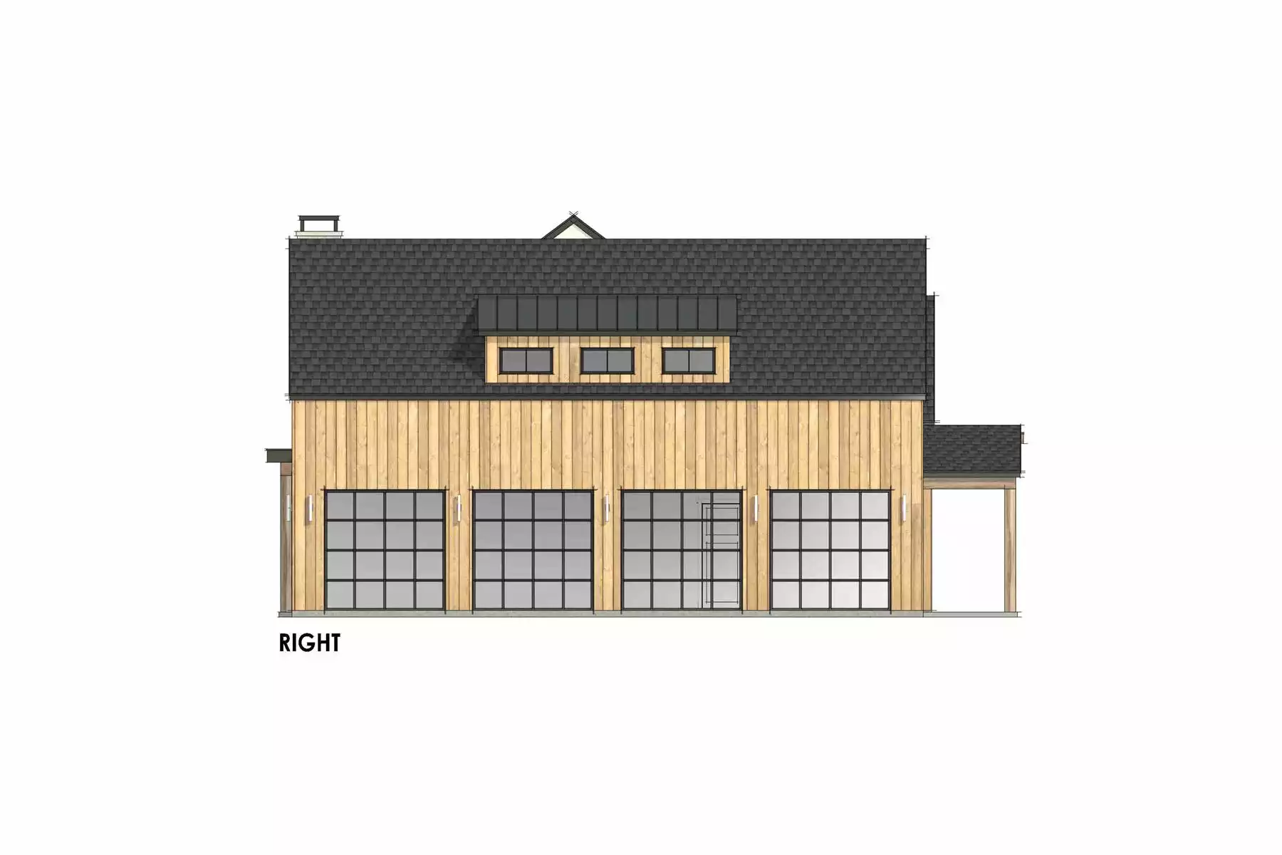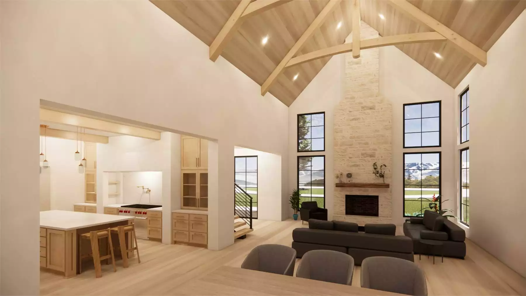 If you're searching for a luxury farmhouse design inspired by contemporary Scandinavian aesthetics, look no further than House Plan 5078! This dramatic home wows from the street with its breadth and balanced facade featuring wood, painted siding, stone, and large windows. It even provides garage parking for four vehicles hidden on one side! When you enter the spacious main level, the floating stairs in the entry hall and the cathedral vaulted great room set the tone for the interior. Ceiling trusses and beams add a rustic touch across the open living area and the large U-shaped kitchen with an island. The family foyer, laundry/utility room, pantry, and powder room sit between the kitchen and the garage while the primary bedroom suite is on the opposite side of the house, through the great room and at the end of the glass-lined hall flanked by the office and courtyard. The suite boasts a vaulted bedroom ceiling, a five-piece bath, a large walk-in closet, and tons of privacy with this location. Three bedrooms with their own three-piece ensuite baths are placed upstairs along with the loft and game room, giving the kids plenty of private space as well!