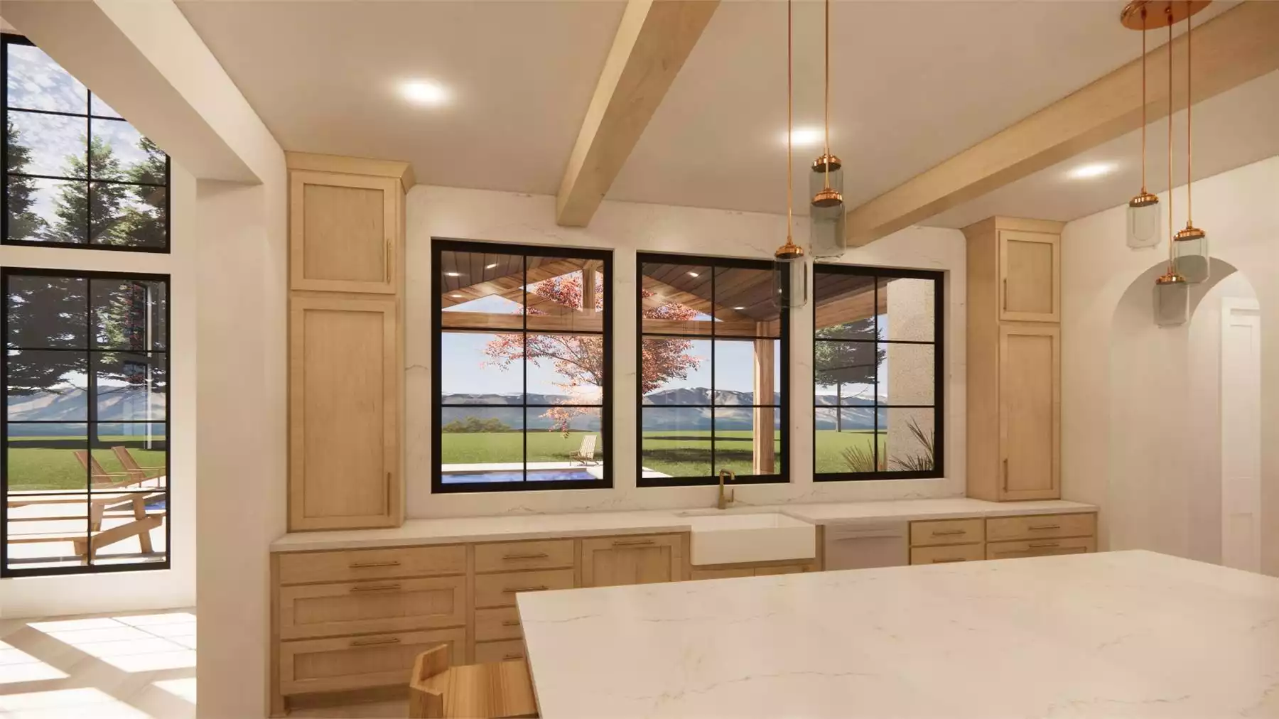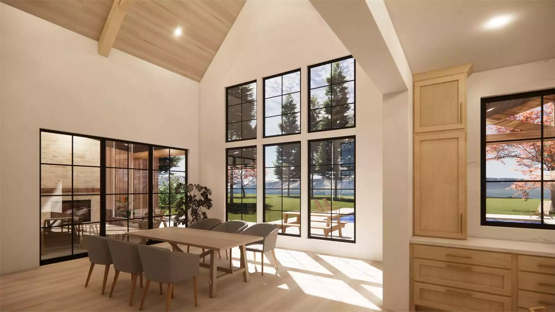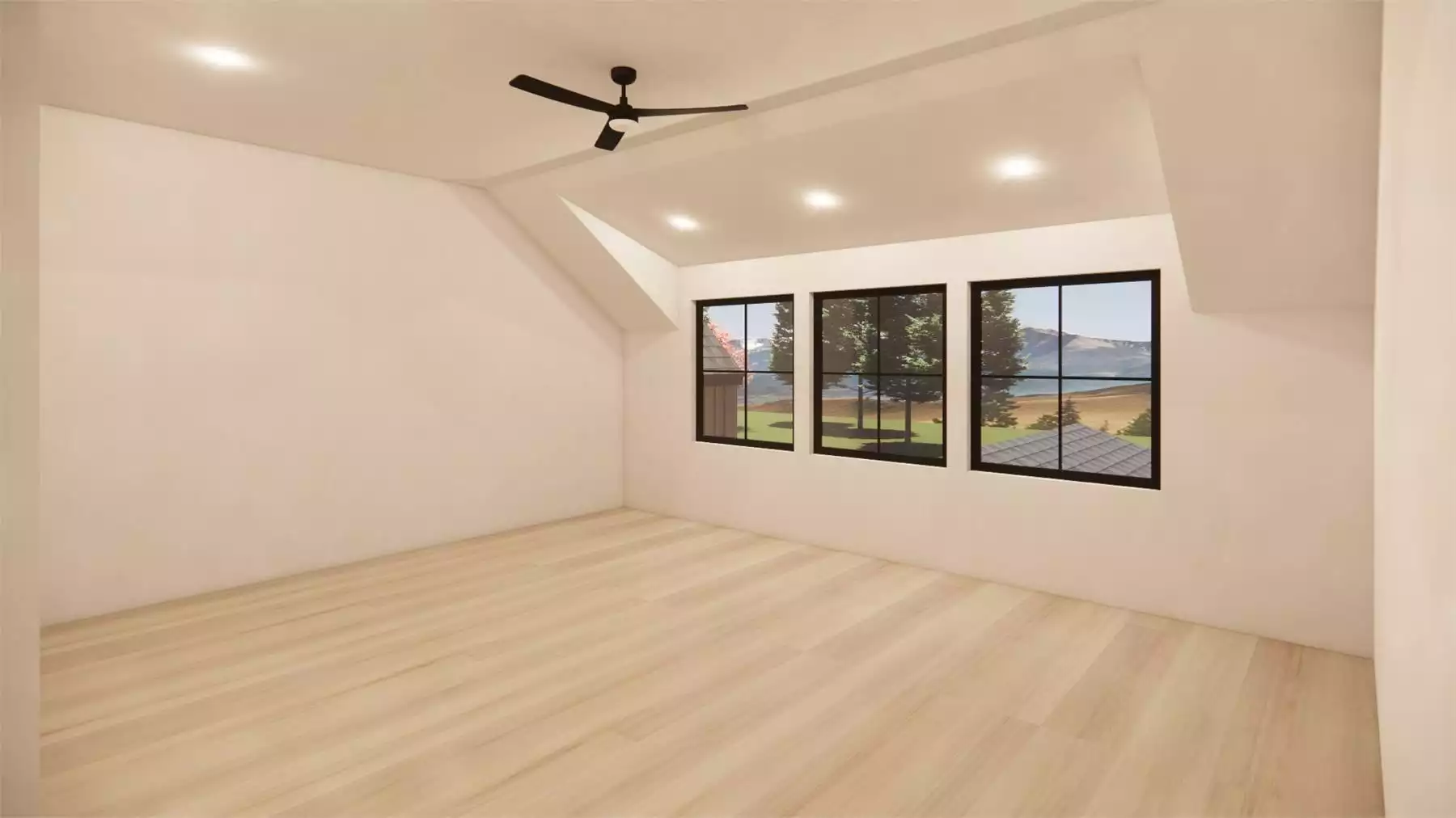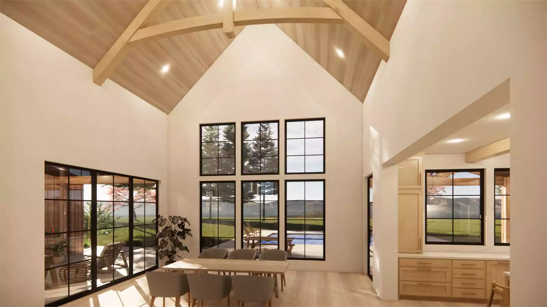 If you're searching for a luxury farmhouse design inspired by contemporary Scandinavian aesthetics, look no further than House Plan 5078! This dramatic home wows from the street with its breadth and balanced facade featuring wood, painted siding, stone, and large windows. It even provides garage parking for four vehicles hidden on one side! When you enter the spacious main level, the floating stairs in the entry hall and the cathedral vaulted great room set the tone for the interior. Ceiling trusses and beams add a rustic touch across the open living area and the large U-shaped kitchen with an island. The family foyer, laundry/utility room, pantry, and powder room sit between the kitchen and the garage while the primary bedroom suite is on the opposite side of the house, through the great room and at the end of the glass-lined hall flanked by the office and courtyard. The suite boasts a vaulted bedroom ceiling, a five-piece bath, a large walk-in closet, and tons of privacy with this location. Three bedrooms with their own three-piece ensuite baths are placed upstairs along with the loft and game room, giving the kids plenty of private space as well!
