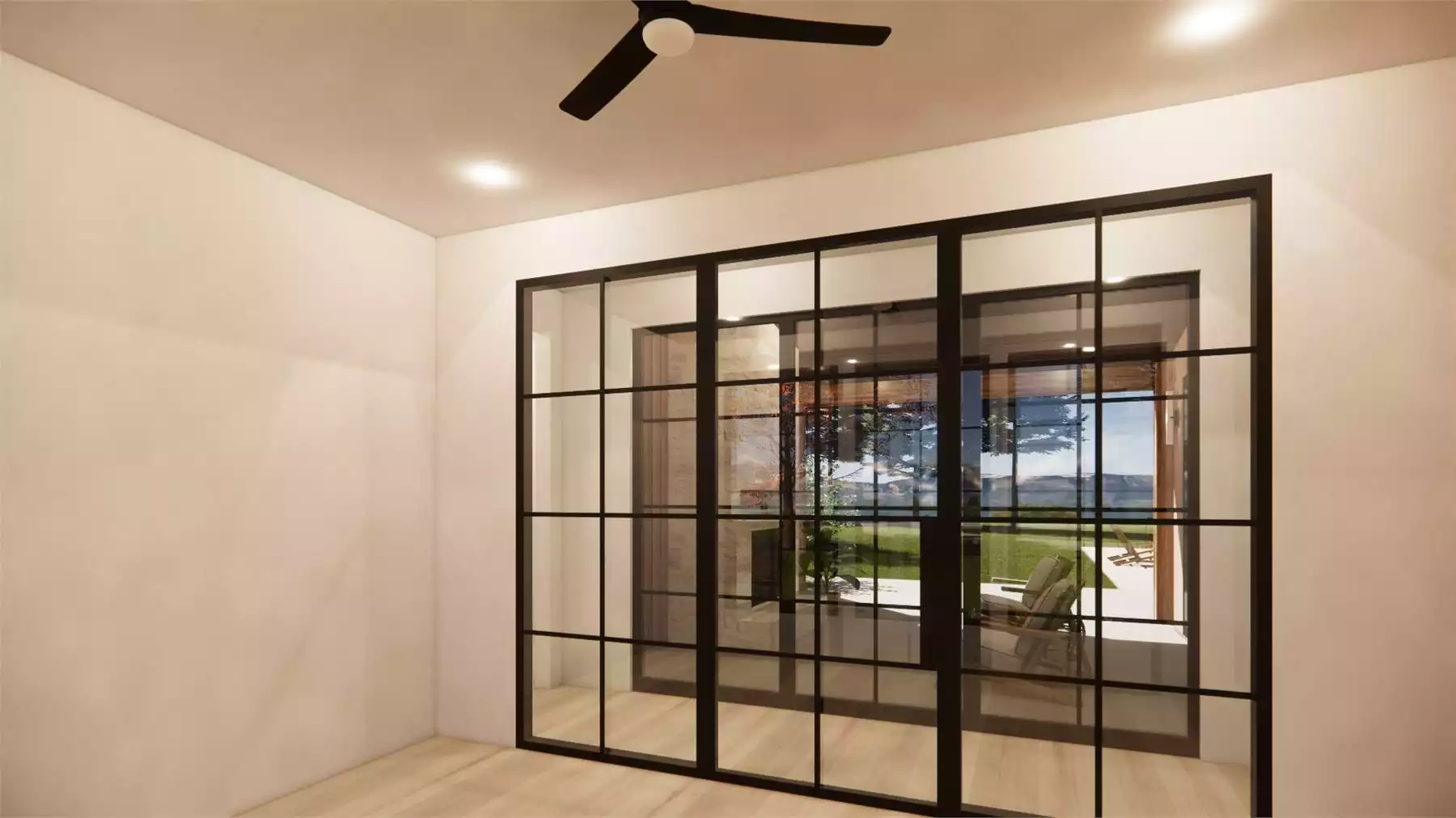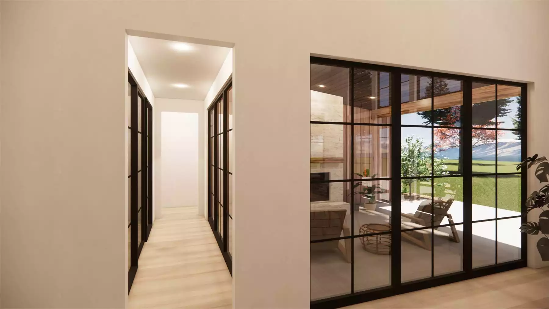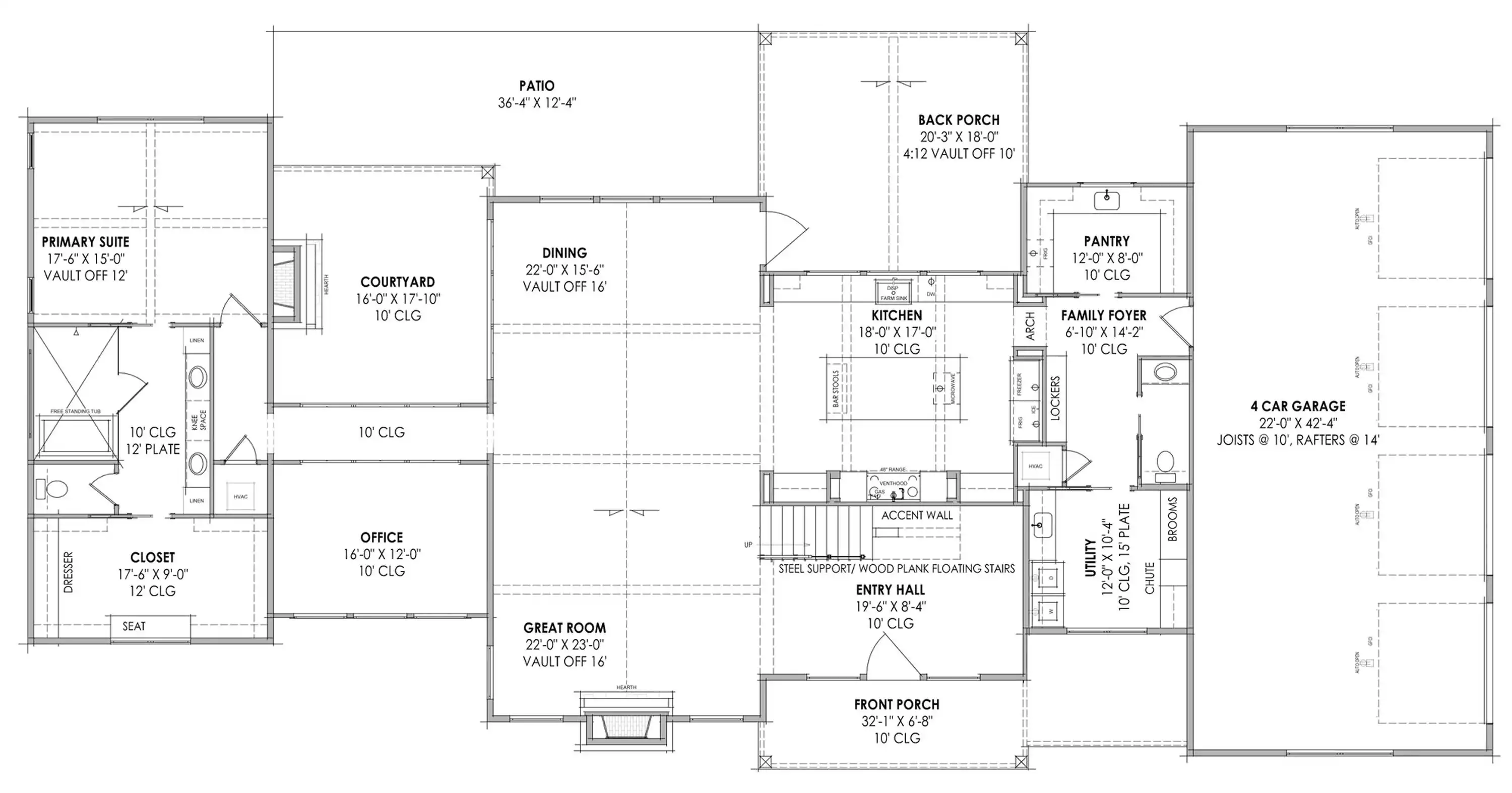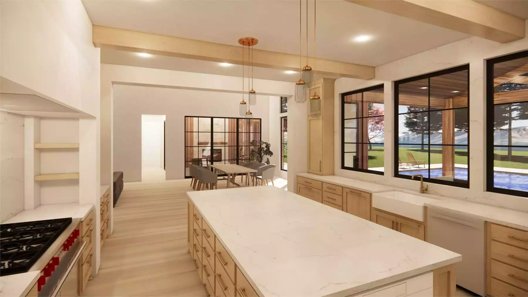 If you're searching for a luxury farmhouse design inspired by contemporary Scandinavian aesthetics, look no further than House Plan 5078! This dramatic home wows from the street with its breadth and balanced facade featuring wood, painted siding, stone, and large windows. It even provides garage parking for four vehicles hidden on one side! When you enter the spacious main level, the floating stairs in the entry hall and the cathedral vaulted great room set the tone for the interior. Ceiling trusses and beams add a rustic touch across the open living area and the large U-shaped kitchen with an island. The family foyer, laundry/utility room, pantry, and powder room sit between the kitchen and the garage while the primary bedroom suite is on the opposite side of the house, through the great room and at the end of the glass-lined hall flanked by the office and courtyard. The suite boasts a vaulted bedroom ceiling, a five-piece bath, a large walk-in closet, and tons of privacy with this location. Three bedrooms with their own three-piece ensuite baths are placed upstairs along with the loft and game room, giving the kids plenty of private space as well!