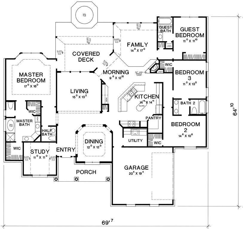 Columns and roof dormers set the tone for this four bedroom traditional style home. Features include a remote master suite, island kitchen, separate living and family rooms, study at the entry and a partially covered rear deck. The garage is side entry.
