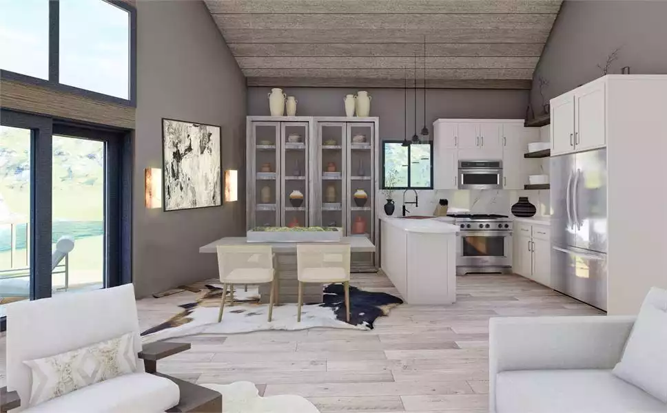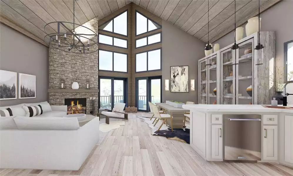 Wraparound deck and soaring windows are some of the eye-catching elements of this home. The living and dining areas open to the spectacular views of the front deck through walls of glass. A stone fireplace and high ceilings give a grand feeling to this space. Upstairs, a balcony overlook leads to the master suite, including high ceiling, private bath and large closet space.