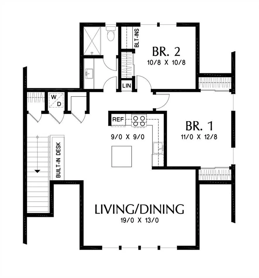 For those who like tiny living, this ADU plan may catch your attention. A craftsman style like this one will offer you the beauty of a larger home for way less. The flow between the kitchen, living room, and dining room makes the space highly functional. The two bedrooms make this a perfect vacation home or a retirement haven with a space for an RV. This plan may also be great for anyone considering building an inexpensive yet quality first home. What this 987 square foot home lacks in size, it makes up for in many other areas.