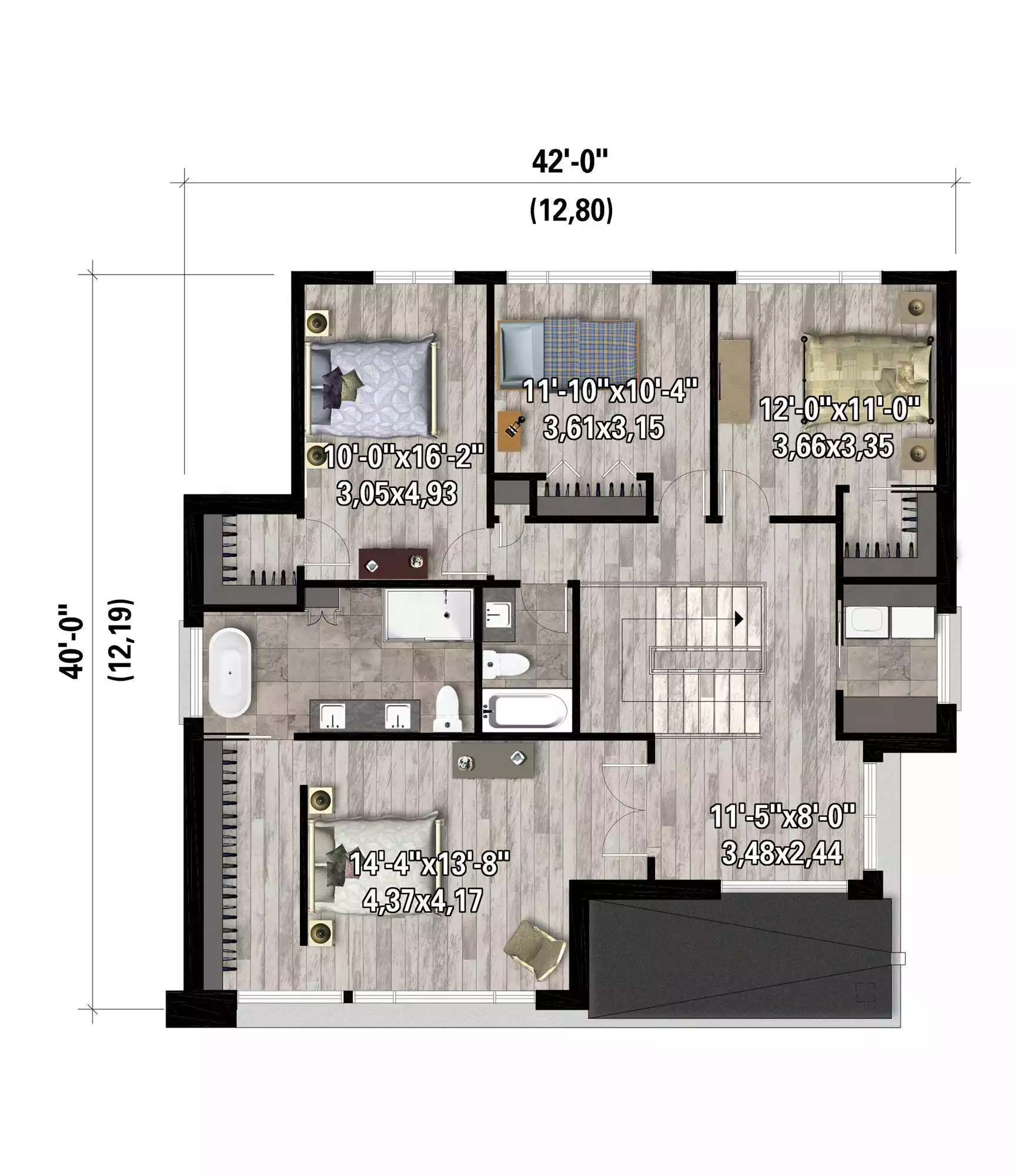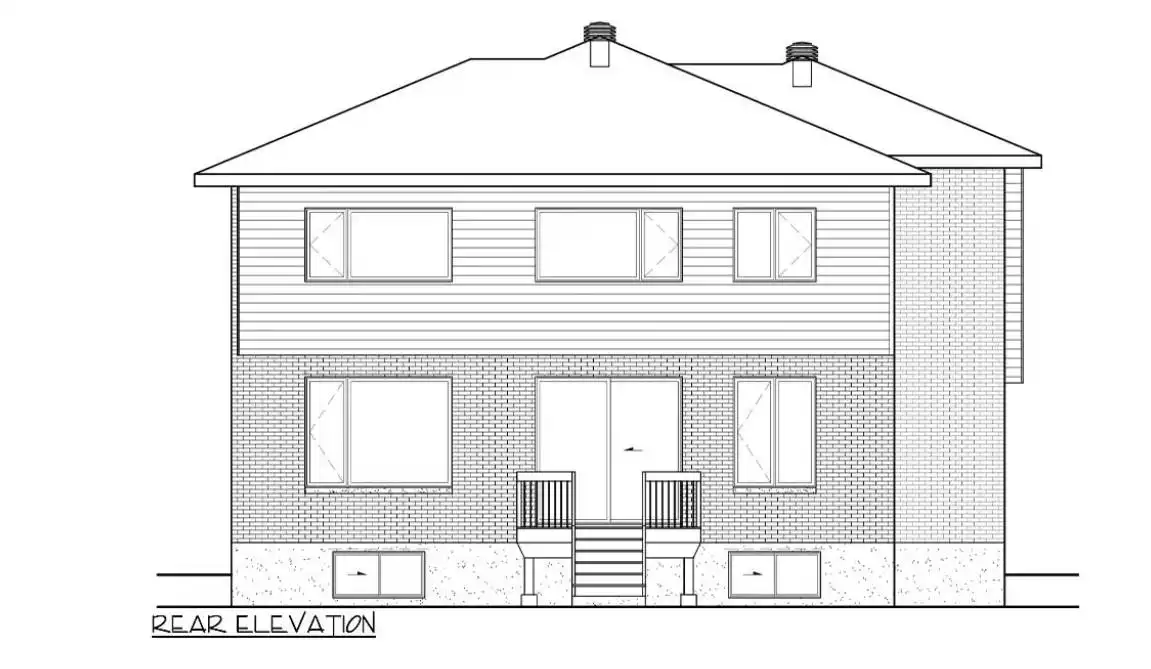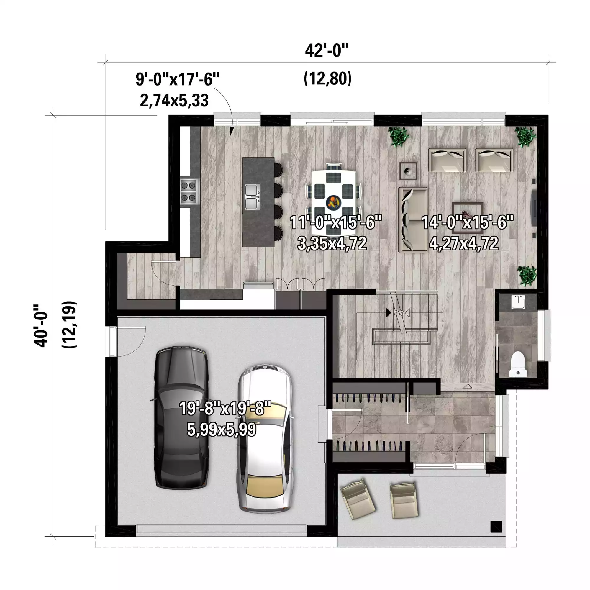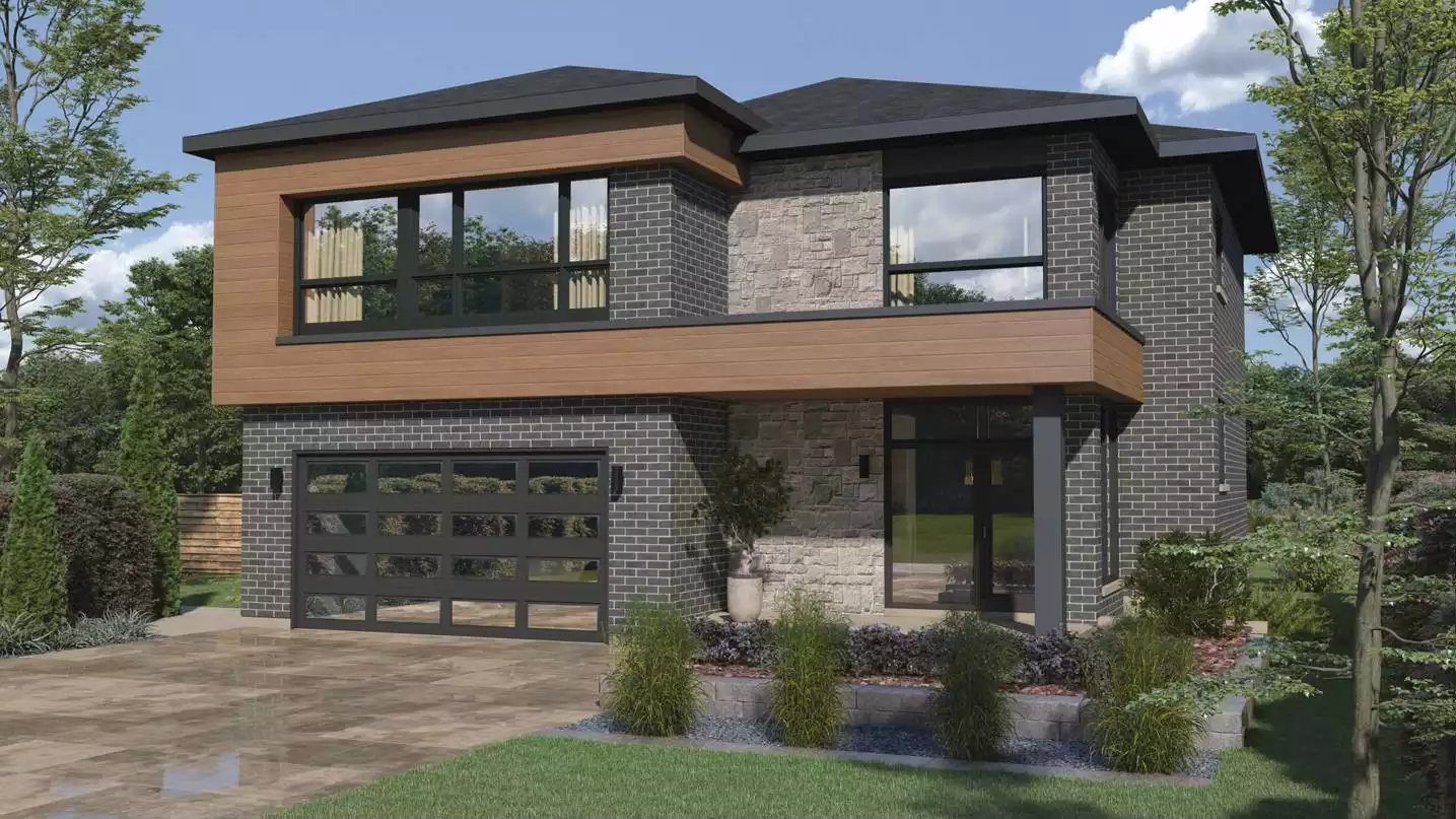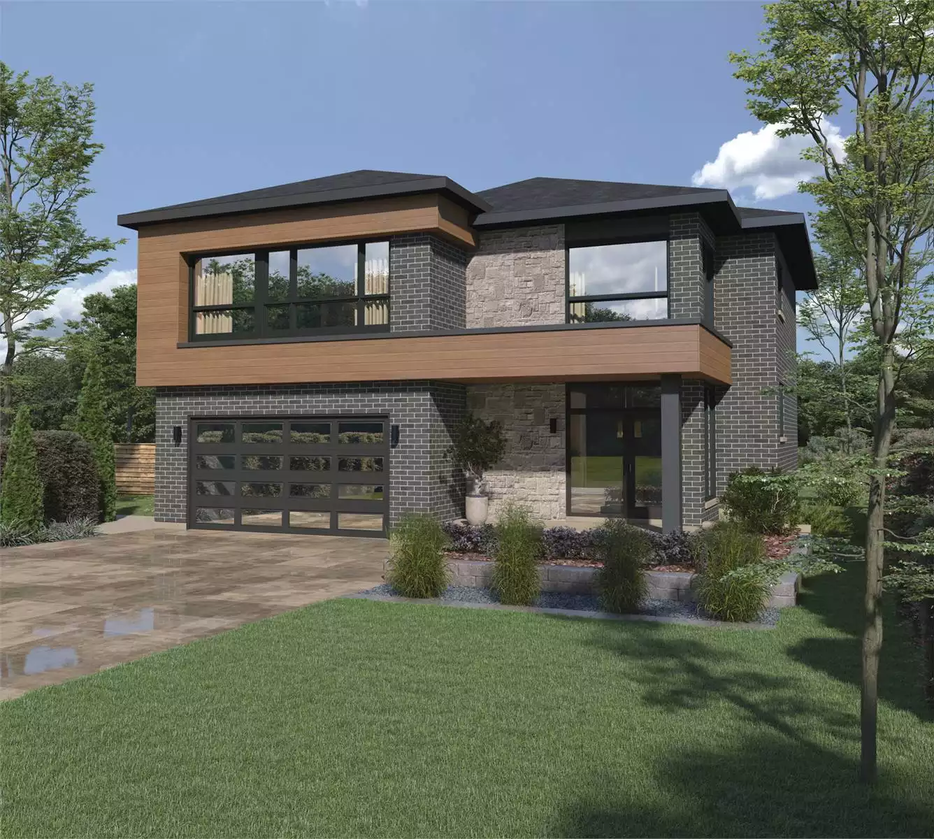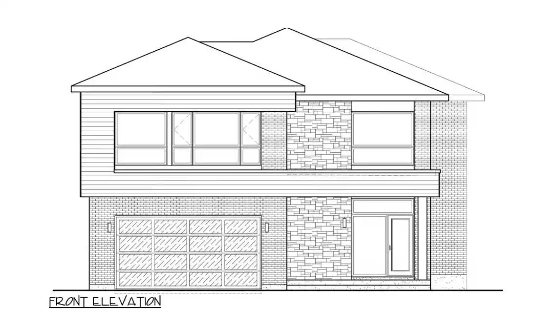 Perfect for growing families! House Plan 8838 is a modern design that spreads its 2,465 square feet across two levels to condense its footprint and reduce building costs. There's also a front-entry two-car garage to help this home fit into neighborhoods with ease. You'll love the walk-through closet that connects the garage and foyer to accept all your outerwear! Step inside and you'll pass the powder room and stairs on your way to the great room in back, which has totally clear sightlines from the L-shaped island kitchen, through the dining area, to the living space. Head upstairs to find all four bedrooms. The primary suite is large and has a mid-century modern-style closet behind a wall as well as a five-piece bath. The other three bedrooms are lined up on the other side of the stairs and share a hall bathroom. The laundry is also on this level for convenience!