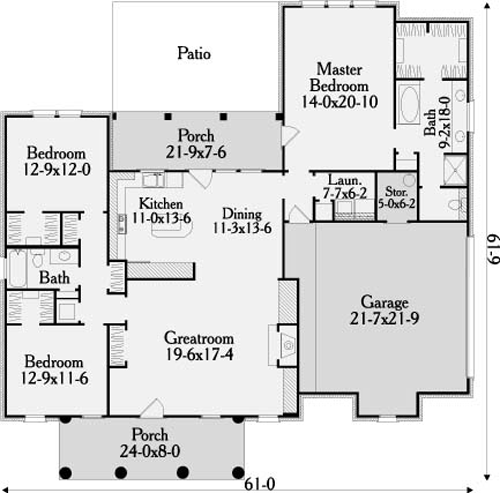 Great use of space in this design. The bedrooms are spacious and offer walk-in closets. In the master suite private access to the rear porch is available. The great room has built-ins surrounding the fireplace and the kitchen presents an island snack bar for additional storage, food preparation and seating.