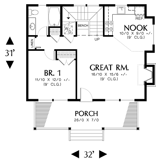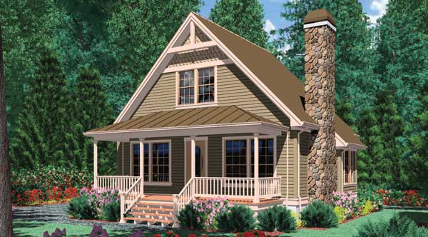 This country cottage would make a great vacation home or year-round abode. Youll want to spend summer afternoons on the front porch, chatting with friends. Inside the home, a fireplace warms the versatile Great Room. The open kitchen flows into a bright breakfast nook. The main-floor bedroom is just steps away from a full bath. Upstairs, a loft with a desk is a nice place for study, reading or sleeping. At only 950 square feet, this is certainly one of our most affordable house plans.