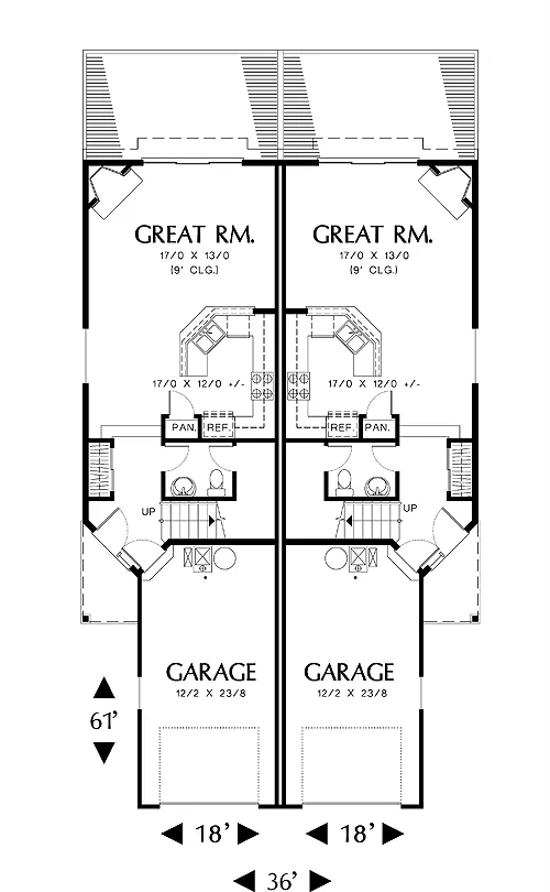 The staircase is T-shaped and splits at the landing to Bedroom 3 on one side and the master suite and Bedroom 2 on the other. The master suite and the right-hand unit's Bedroom 3 features box-bay windows. Note the laundry alcove on the second floor and dual sinks in the master bath. A one-car garage at street level is reached by a door in the entry hall.