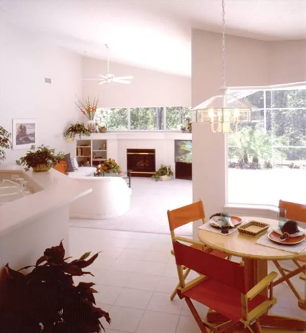 Touches of stone veneer and a bay window treament add a warm country flavor to the elevation. Once inside, the formal living room has a wonderul view to the rear outdoor living space. Unique columns frame the formal dining room with a built-in furniture niche. The secluded master suite wing includes a bedroom with sliders to the patio and is of generous proportions. The master bath is a study of symmetry, with the soaking tub being the focal point. Bay windows frame the tub and on either side are vanities and closets. A large shower and private toilet chamber complete the design. The family wing of this home boasts an island kitchen overlooking the breakfast nook and thrilling family room with uniquely angled media/fireplace wall. Three bedrooms share an oversized full bath, which doubles as a pool bath.