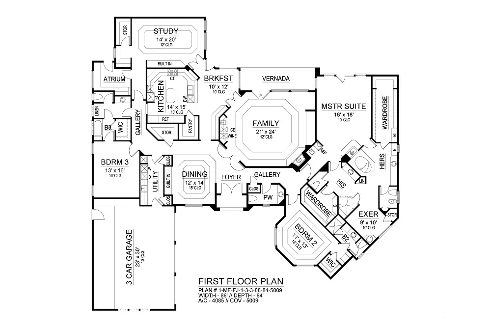 the house plan inside the turret area, is a family bedroom with 14 trey ceiling, walk-in closet