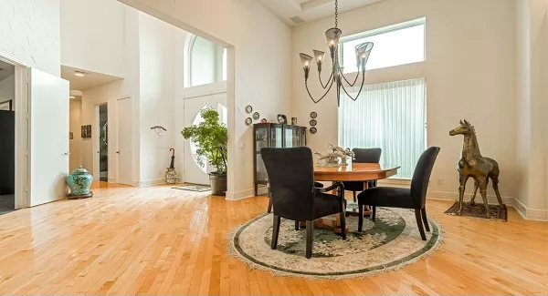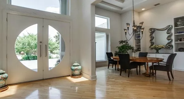 that make the round glass in the middle of this front door. The two-story foyer opens into the