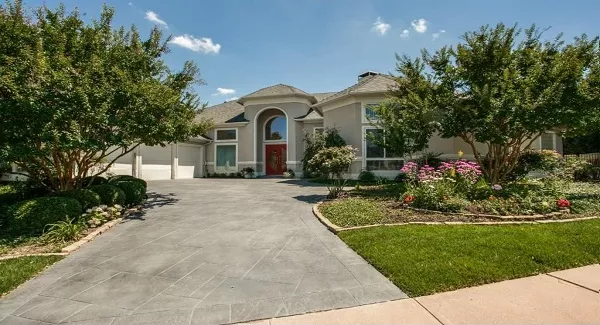 The exterior facade is stucco with trim around the windows and under the eaves. A turret-like area