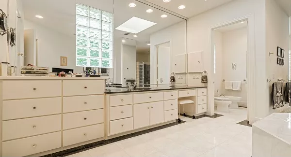vanity, linen closet, block glass shower, and a large wardrobe with built-ins. At the very front of