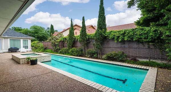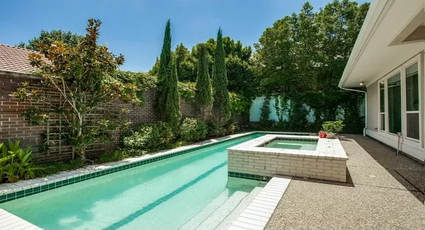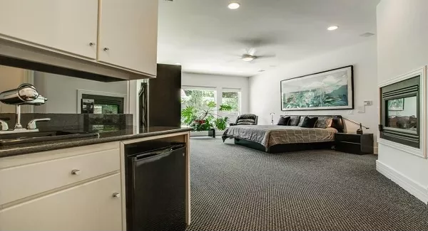 access to the backyard, a sink and refrigerator, and a his and hers bath that share an exercise