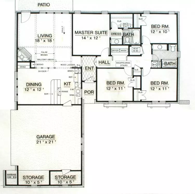 Unlike many home plans, it is a very basic and simple design that is inexpensive but it packs a lot of curb appeal with its chalet style exterior. The living, dining and kitchen is very open creating the look of an enormous space but with subtle division of the rooms. The living room ceiling slopes from 8 at the back wall to a height of 14 at the fireplace. The fireplace is a real brick wood burning fireplace flanked by built-in book shelves. The master suite is moderately sized and has a full private bath with a large walk-in closet. The other 3 bedrooms are modest size and each has a generous size closet and access to the hall bath. The double garage has adjoining storage rooms and there is even a covered bin for those unsightly garbage cans.