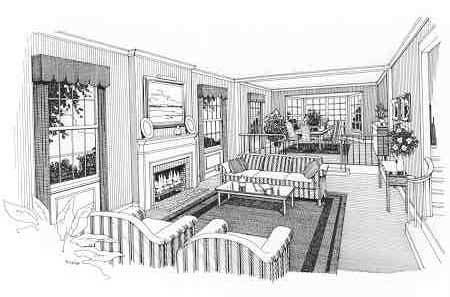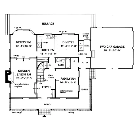 A large fireplace warms the spacious, sunken living room of this home. A railing separates the living room from the dining room, up two steps. Sliding glass doors set in a bay window access a terrace. The U-shaped kitchen and the dinette flow together to create an informal space that is sure to become the heart of family life. The big family room has a built-in entertainment center.