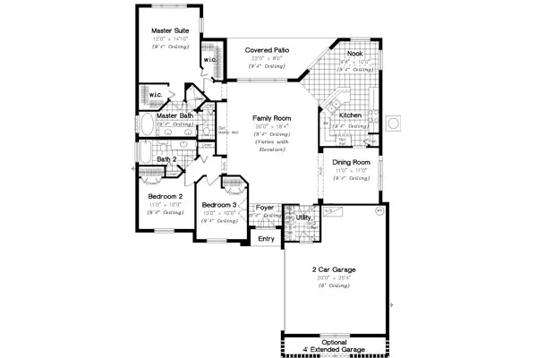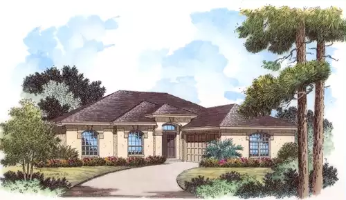 This is the perfect home plan for a young family or for Grandma and Papa. Three bedrooms are enclosed in a Mediterranean-style exterior. High flat ceilings make this home live and feel much bigger. The sumptuous master suite boasts his and hers walk-in closets, a dual-sink vanity, a garden tub, and a separate shower. Two secondary bedrooms with nearby bath are great for kids or guests. A nice sized walk-through utility room and an oversized two-car garage with workshop area or extra storage make this the perfect home for you.