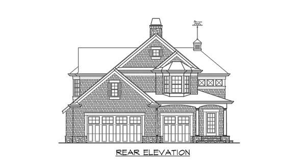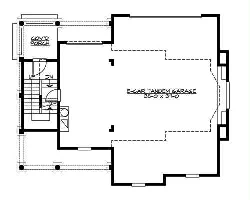 This Astoria Cottage is the matching playhouse or guesthouse and overflow garage for our popular Astoria plan. A window-lined entry stair tower that leads to an open living/gaming space with a kitchen, laundry, bathroom and private bedroom flanks the oversize five-car tandem garage. The facade has all the charm of the Astoria with its arched wraparound porch, stone and shingle siding and elegant trim.