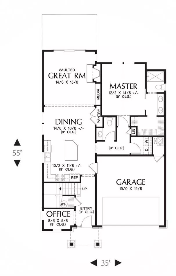 Simplicity meets charm in this Craftsman plan that features a footprint that can fit on virtually any lot size. This home’s enjoyment begins from first glance, as its curb appeal is paired with practical features such as the 2-car garage and covered front entryway. Past the front door, you’ll find a private home office, tucked away from the noise and bustle of the rest of the home. As you progress further, you’ll move past the open-air staircase and finally into the open concept combination of the dining room, island kitchen, and vaulted great room. Patio access is available off of the great room, while a conveniently located powder room is nearby. Finally, you’ll love this level even more, thanks to its first-floor master suite, complete with a spacious dual-vanity bathroom and large walk-in closet. Upstairs, you will notice that there are plenty of spaces for kids and guests alike, thanks to the three full bedrooms, each with walk-in closets, and the open loft area with a built-in computer station. This practical sleeping space makes having visitors completely possible and even enjoyable!