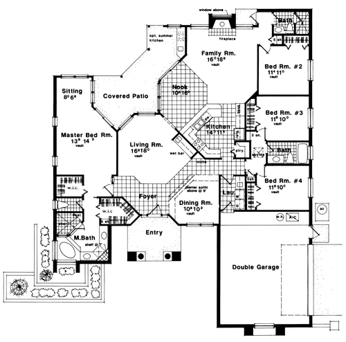 The covered entry leads to the foyer, which flows into an angular, vaulted living room with a wet bar.