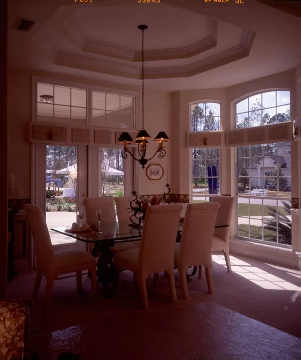 The dining room has a trayed ceiling and has French doors, which lead to a covered porch replete with columns.
