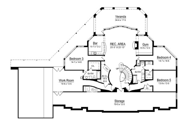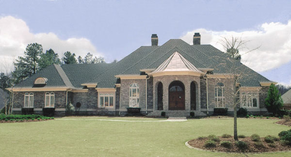 A conical turreted portico, with arches set in a brick facade, sets a distinctive tone for this Chateauesque design. Steeped in elegance, a carefully-crafted double-doored entrance leads to a grand spiral staircase in the foyer. Behind the staircase lies a prestigious gallery, leading to the grand salon. An enchanting veranda anchors the plan, at the rear of the floor, with an angled deck along the left side. A generous keeping room provides the perfect space for family congregation, between the kitchen and breakfast nook. The garage fits three cars, with space for storage. More storage space is on the upper floor, along with an upper veranda, recreation area, three plush bedrooms, a recreation area, gym, separate work room, and built-in bar. The master suite hosts a private sitting room, wet bar, a stately tray ceiling, and abundant His and Hers closet space.