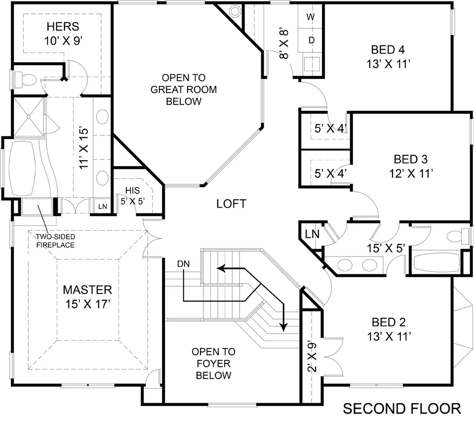Hints of Greek Revivalism blend beautifully with Early American style for a handsome home with world-wide appeal. The entry is gracefully lit by a second-story arched window and leads guests into a bayed living room. The great room is ready to host any occasion, with a corner fireplace and built-in entertainment center. The kitchen has a central island and easily serves the breakfast nook and dining area. Upstairs, three bedrooms line the right side of the plan, and the master suite is on the left. Here, vaulted ceilings and walk-in closets are lovely luxuries, but the real standout is the bath, with a whirlpool tub and a see-through fireplace shared with the bedroom.