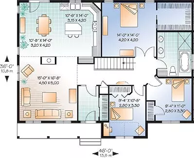 A delightful bungalow, this house plan offers plenty of space and plenty of savings to ensure that you get the house that you are looking for, at a price that you can afford. What this 1,521 square foot home lacks in size, it makes up for in delightful charm. Cape cod styled finishes adorn the home and are seen in features such as the covered front porch and large ornate windows. As you enter this home, you are greeted with a spacious foyer and closet with plenty of storage. To the left of the entryway, you will find an open living room and kitchen space, as well as a dining room. The expansive kitchen offers an island with informal seating, while the dining room has space for a larger table for more formal meals. A large living room allows for the whole family and guests to be together and enjoy company and relaxation. To the right of the main entrance, you will find a spacious hallway and 3 bedrooms as well as a shared full bathroom. Each bedroom has a large closet and living space, including the master which is 196 square feet by itself and features a spacious walk-in closet. Simple and orderly, this home has been planned around creating maximized efficiency both at home and in your life.