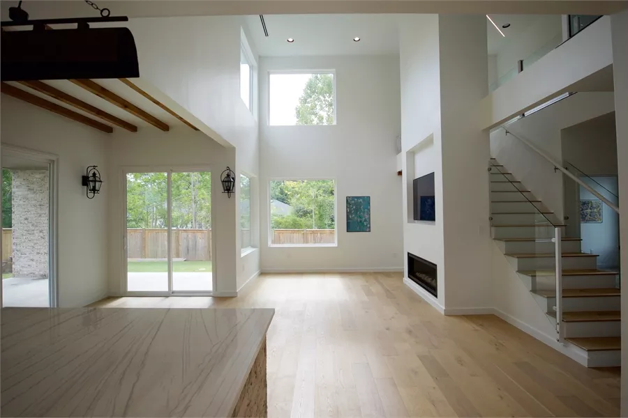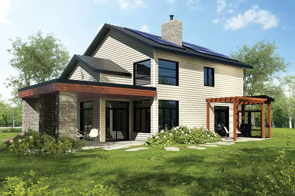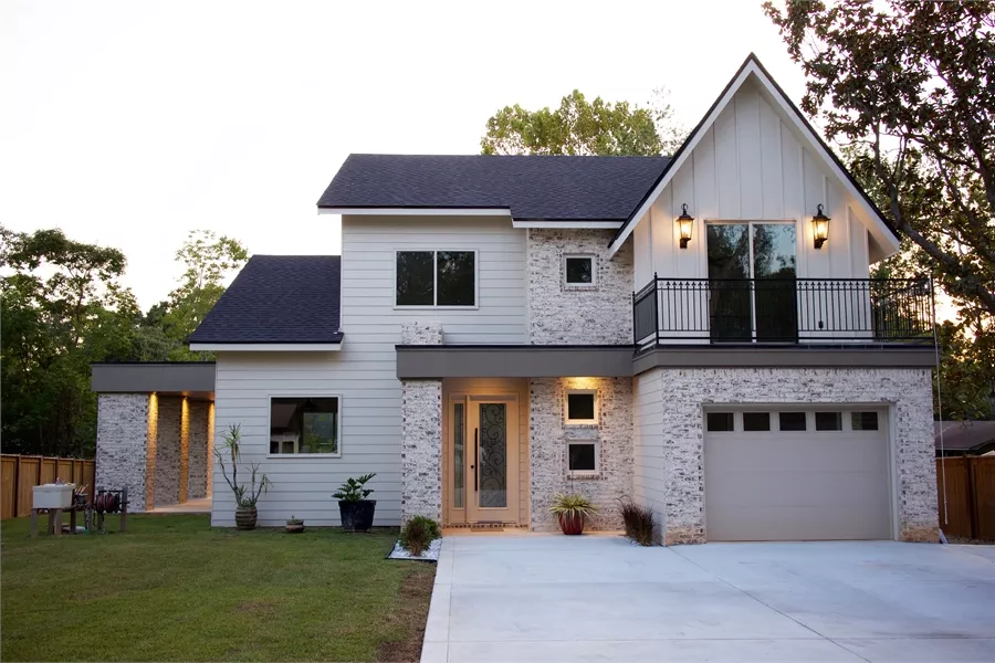 A home that is as gorgeous and unique as the flower that it is named for, this modern farmhouse style plan is blooming with great space. Offering 1,944 square feet, this 2-story home is a great option for a family and can adapt to practically any lifestyle, thanks in part to the 4 bedrooms and 2 bathrooms. A modern take on a timeless classic, this home features maximum curb appeal. A mixture of stone, exposed wood and vinyl siding, along with corrugated metal roofing, makes this home a modern beauty, mixed with the quaint charm of a farmhouse. A garage and front entryway begin this home and give way to a foyer and spacious hallway closet. The front door opens in to a grand foyer, followed by a gourmet kitchen that is great for entertaining. Plenty of counter space, a large island, and a walk-in pantry, make cooking and preparing food synonymous with time spent with friends and family. The kitchen is open to the dining room and family room, thanks to this home’s open layout. Accessible through the dining room, this home also features a covered outdoor patio space to the right of the building, as well as a private patio and pergola, found off of the main floor bedroom. The second floor of this plan is just as amazing. Moving upstairs, you look down upon the living room thanks to its 2-story vaulted ceilings. Three more bedrooms and a large shared bathroom are also located upstairs, as well as a large walk-in closet and private balcony that are found in the master bedroom.