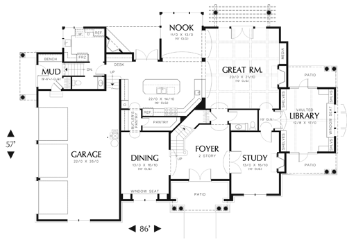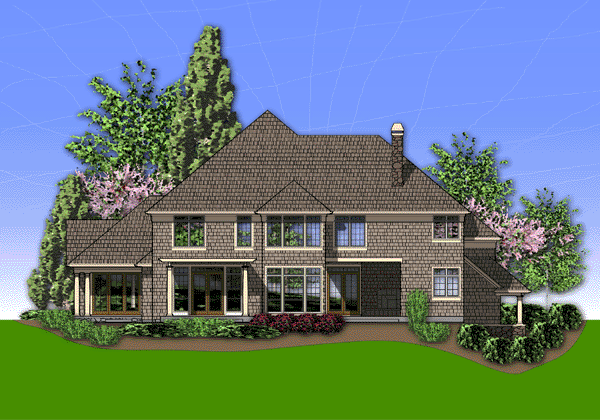 Spacious inside, the plan has left nothing to chance in the way of livability. The main level contains a study, a vaulted library with built-in shelves, a great room with media center and fireplace, and an island kitchen separating a casual nook and a formal dining room. A service hall leading to the triple garage features a stairway to the upper level, a mudroom with bench, a laundry room with space for an extra refrigerator and freezer, and a half-bath.