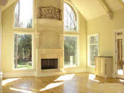A stone-and-siding exterior, spires and interesting window details add to the elegance of this four-bedroom mansion. A keeping room with a pass-through to the kitchen and a fireplace with a built-in wood box, and a formal dining room with a fireplace on the first floor allow plenty of social possibilities. Separate guest quarters with a full bath, a lounge area and an upstairs studio, which is connected to the main house by a gallery, further enhance this home's livability. Four bedrooms with two full baths are found on the second floor, including the master suite with a fireplace.
