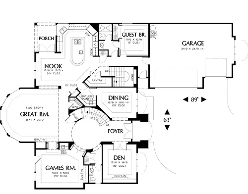 The spacious kitchen and dining nook are defined by a tray ceiling. At the hub of the elegant kitchen, the curved island is equipped with a cooktop, vegetable sink, and snack bar. To supplement kitchen storage, there's a walk-in pantry with double doors beneath the back staircase. Between the kitchen and angular dining room, a butler's pantry facilitates the serving of formal meals. It's furnished with cabinetry, countertop, and a sink. A wine cellar is just around the corner.