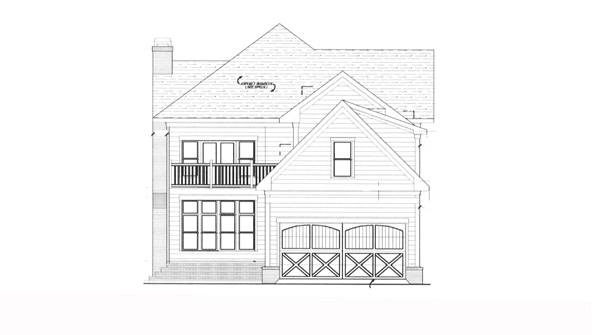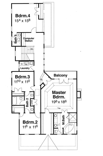 The Master Suite has a platformed raised entry creating a dramatic entry while allowing for high ceilings in the foyer/living/family rooms below. The balcony off the master bedroom provides partial cover for the rear patio behind the family room.