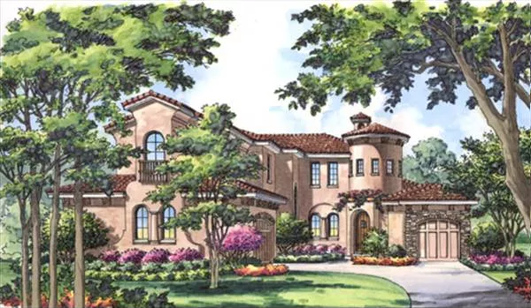 European / Italian grandure is evedent in this old world style home. The large two story foyer turret, with its coffered ceiling, greats you upon entry to this magnificent home and opens into the huge voluminous two story great room that takes your breath away. Also off of the foyer is the entry to the master suite and private 1 car garage. The master suite has it all with a juice bar opposite the entry to the oversized master bath with garden tub, door less walk-in shower, private toilet chamber and his and her vanities, her's with a make-up area and of course a large walk-in closet. On the other side of the great room are the arched entries to the dining hall and kitchen. The dining hall has a coffered ceiling. The island kitchen is large with a nook area that opens with corner-less sliding glass door that makes you feel like the kitchen nook area is part of the covered patio area. A great feeling of space. Also off the great room is a secondary bedroom and bath, laundry room and 2 car garage. The stair leeds to 2 additional bedrooms that share a jack-n-jill bath, a nice loft area and a media room for that home theater system. Note the openings to the great room below.