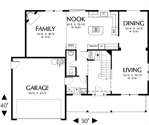 Note the half-bath in the main-level hall and the laundry room, which has enough space for a utility sink and opens to the two-car garage.