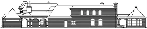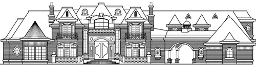 This French Country chateau house plan really has it all. Externally the plan offers a front porch, verandas, patios, and concept pool, plus a cabana with a kitchen and built-ins. The main living area on the first level consists of a two-story foyer with double curved stairs to the second level. The dining room and study have fireplaces and doors to the front verandas. The dining room leads to the wine room, large butlery and pantry and into the kitchen and breakfast area. These rooms are separated only by the center eating bar. There is also a working center island. Around the corner is the dumbwaiter to send food to the second level. Off the living room is the circular music room with windows that face the patio. The master suite has a lovely sitting area and luxurious master bath with sauna, separate shower, garden tub and bar. The oversize wardrobe has a safe room. There is easy access to the gym from the master suite or from the second main-floor bedroom. The second bedroom offers a sitting area and bath and could be converted into a guest room or in-law suite. The second story of this luxury house plan can be reached by the elevator off the living room or up the double circular staircase in the foyer. Five family bedrooms with bathrooms and closets share the second floor with an exercise room with bar, a reading room, hobby room, media room, game room and lounge. There are plenty of balconies from which to enjoy different views.