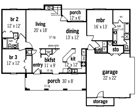 With 12' ceilings in the entry, breakfast, kitchen, dining, living and front porch, this delightful ranch home is light and airy. The living room features a wood burning fireplace and built-ins. Maximum storage has been carefully designed into the home with a linen in the bath, a phone niche and pantry in the breakfast area and two storage rooms off of the garage. This is a super energy saving design featuring 2x6 exterior walls.