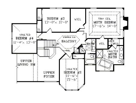 An open stairway leads to a railed balcony and four bedrooms upstairs.