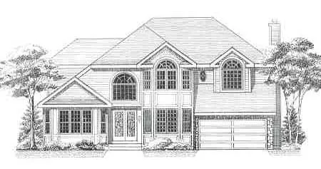 High half-round windows attract attention to this dramatic two-story. The optional stone veneer adds a rustic touch.