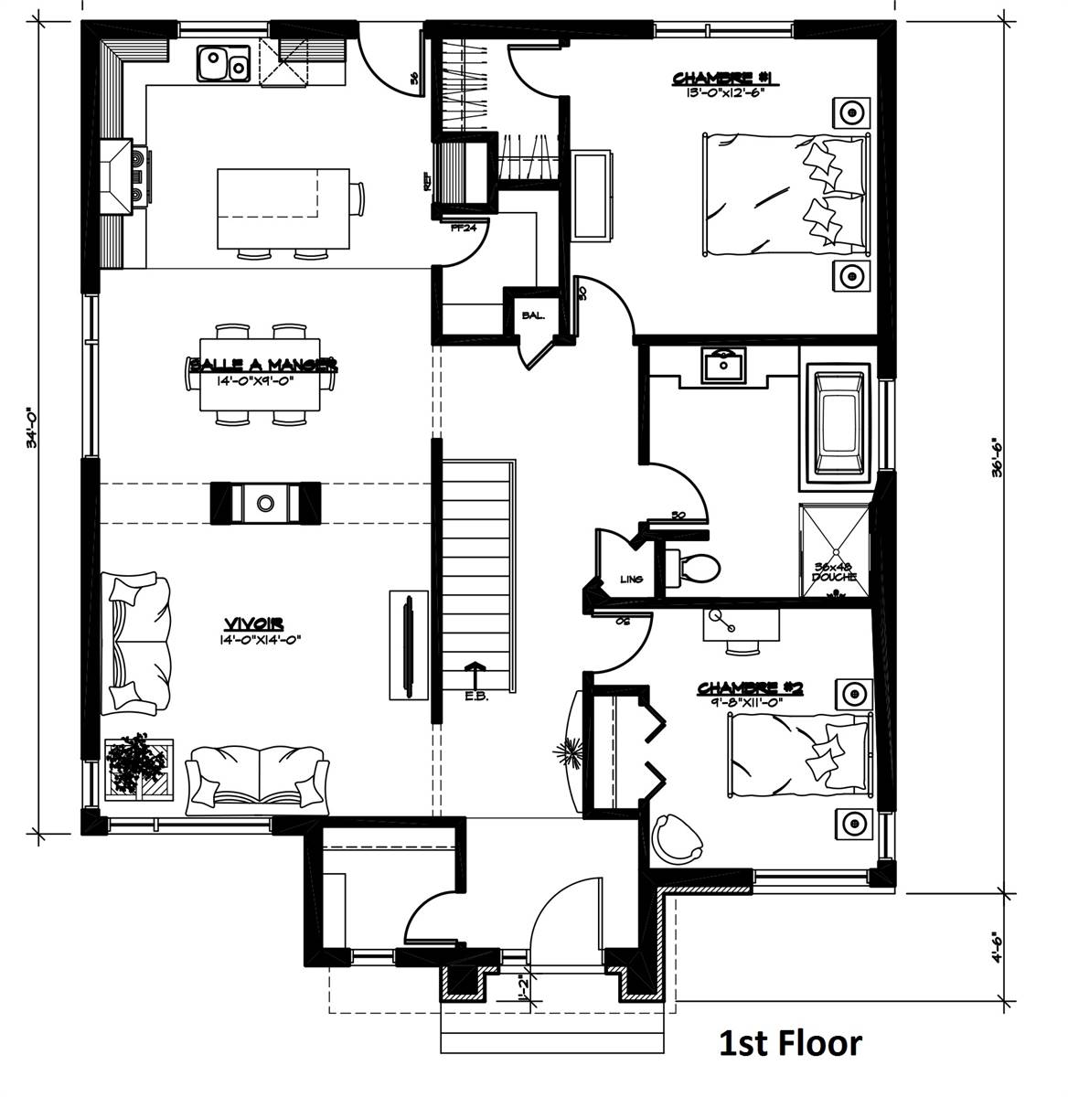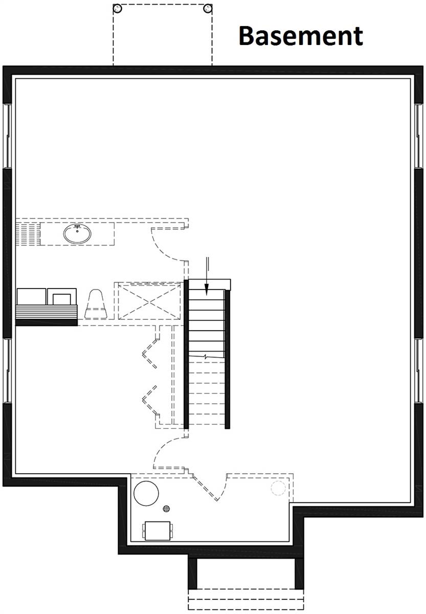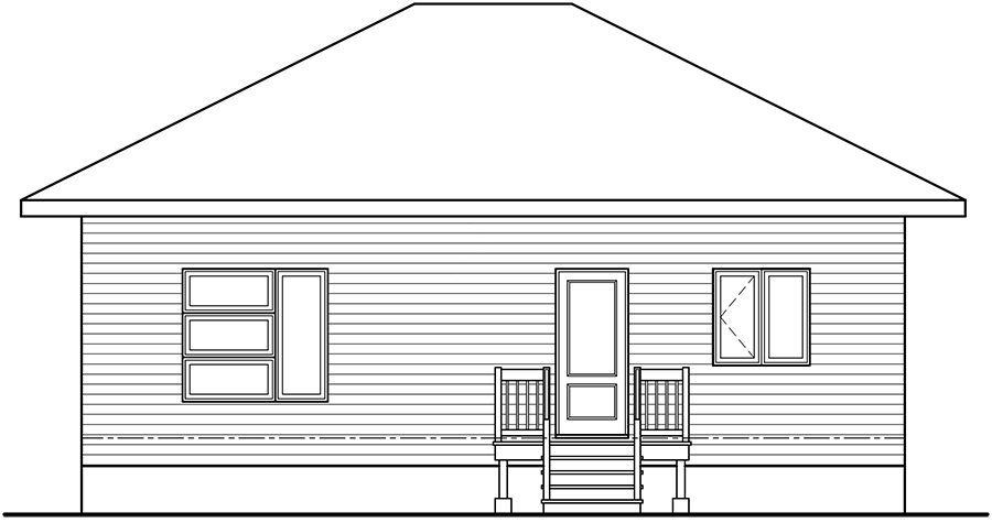 Modern 2-bedroom, style home plan with open floor plan layout. This house plan conception that offers many commodities that you will surely appreciate. For starters, the good sized entrance has a very practical walk-in style closet. You will also notice that the bedrooms are separated by a wall that allows for less noise even if there are ongoing activities in the living room, great for a good night sleep! The dining room and living area are separated by a central fireplace. The kitchen is equipped with a good sized island as well as a big walk-in pantry. Natural light will be greatly appreciated from the big window near the dining room as well as from the exterior back door. The main bedroom is situated in the back of the house and also has a convenient walk-in closet. The family bathroom offers a bath and a separate shower. The laundry room is situated on the basement level that is yours to finish when and as you please.