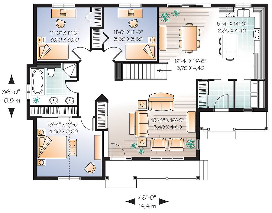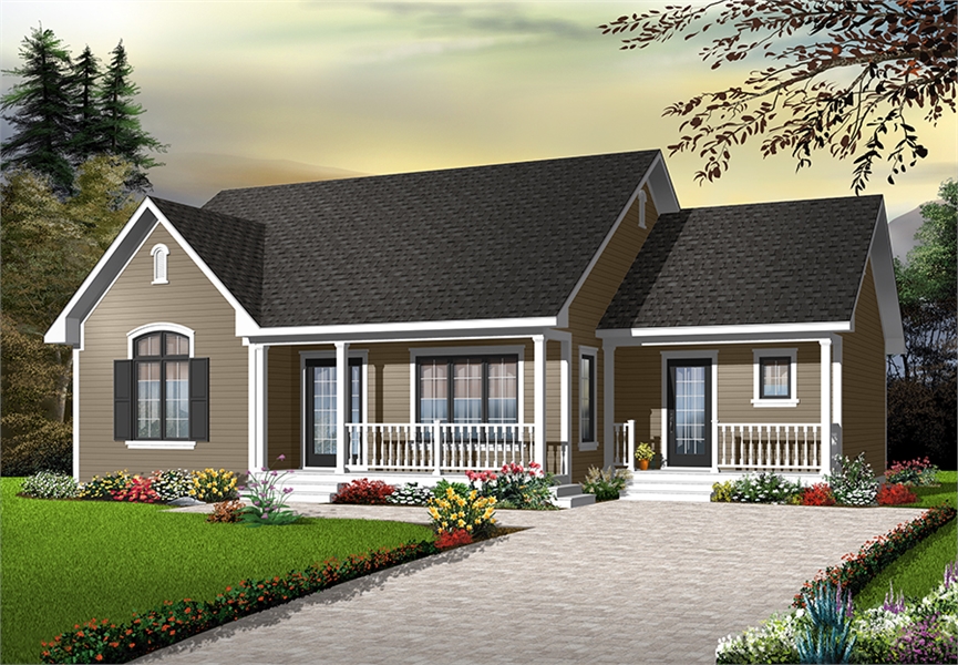 Modern ranch style house plan with 3 bedrooms. Closed foyer in the right entry and a closet for each entrance.