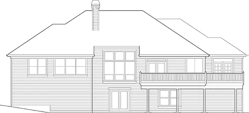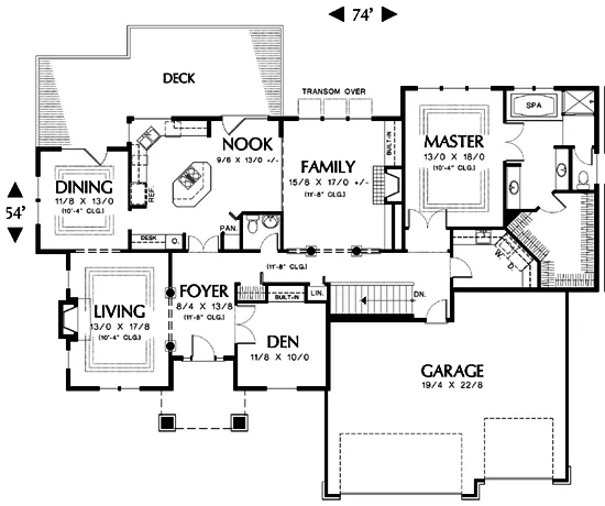 This home plan is efficiently designed along a central hallway. Pairs of columns define the entrance to the living room and family room. Double doors lead to the kitchen and informal dining nook. The kitchen is furnished with a corner pantry, a built-in desk, and an angular island, which is equipped with a self-venting cooktop and a sit-down snack counter. French doors in both dining areas open to the deck, facilitating cookouts and outdoor entertaining.